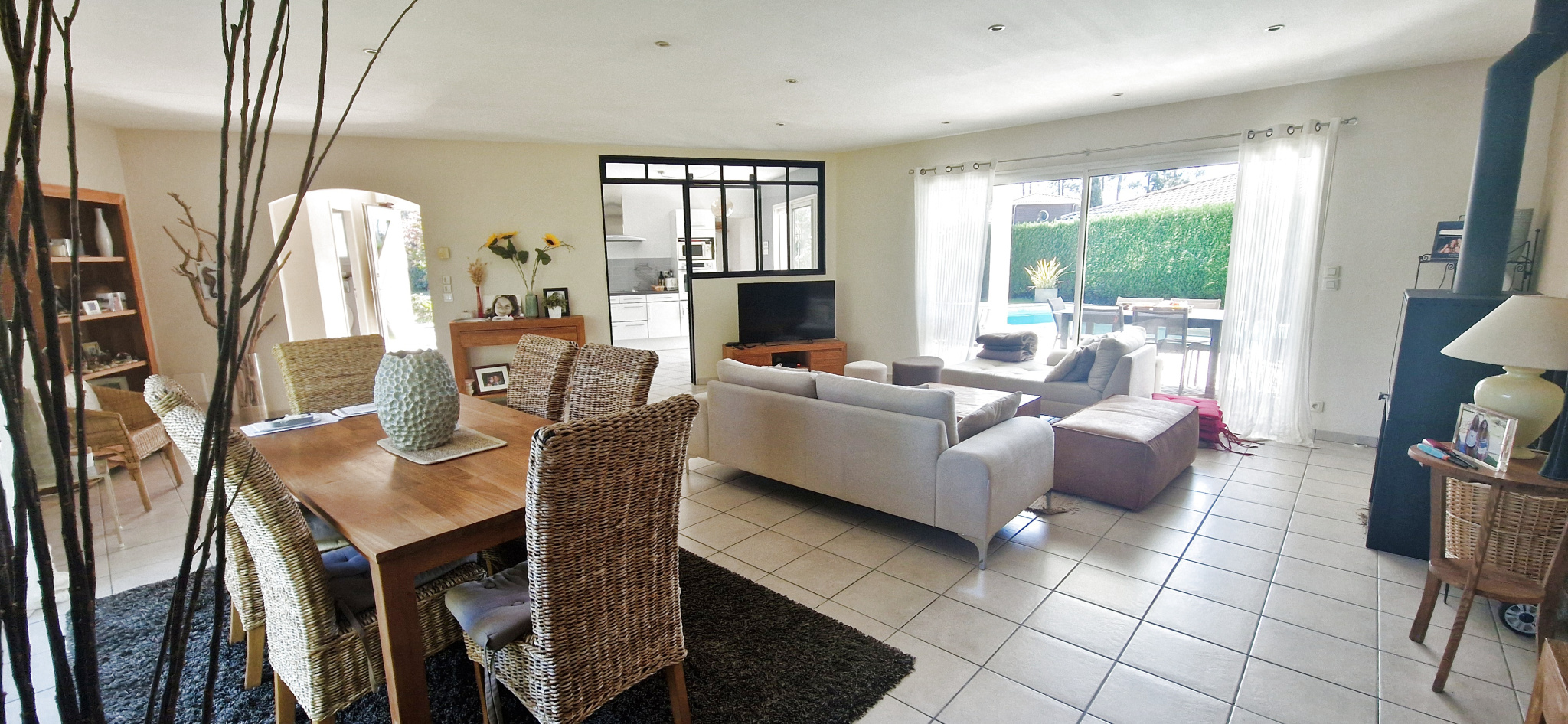 Elle se compose d'une entrée avec placard ouvrant sur un vaste séjour / salle à manger lumineux donnant sur la terrasse et la piscine, ainsi que d'une cuisine entièrement équipée avec cellier/buanderie attenant. Un dégagement dessert quatre chambres, dont une suite avec salle d'eau, un dressing, une salle de bain avec WC et un second WC indépendant.