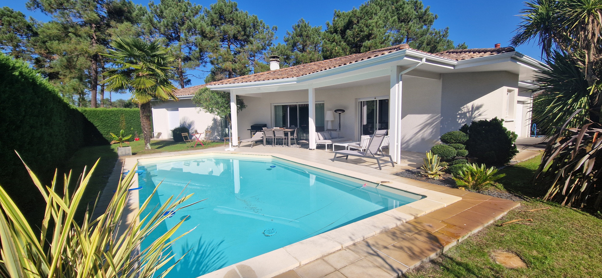 Situation privilégiée pour cette belle maison, en excellent état, implantée sur une parcelle de 1 080 m2 en lisière du Golf de Lanton.