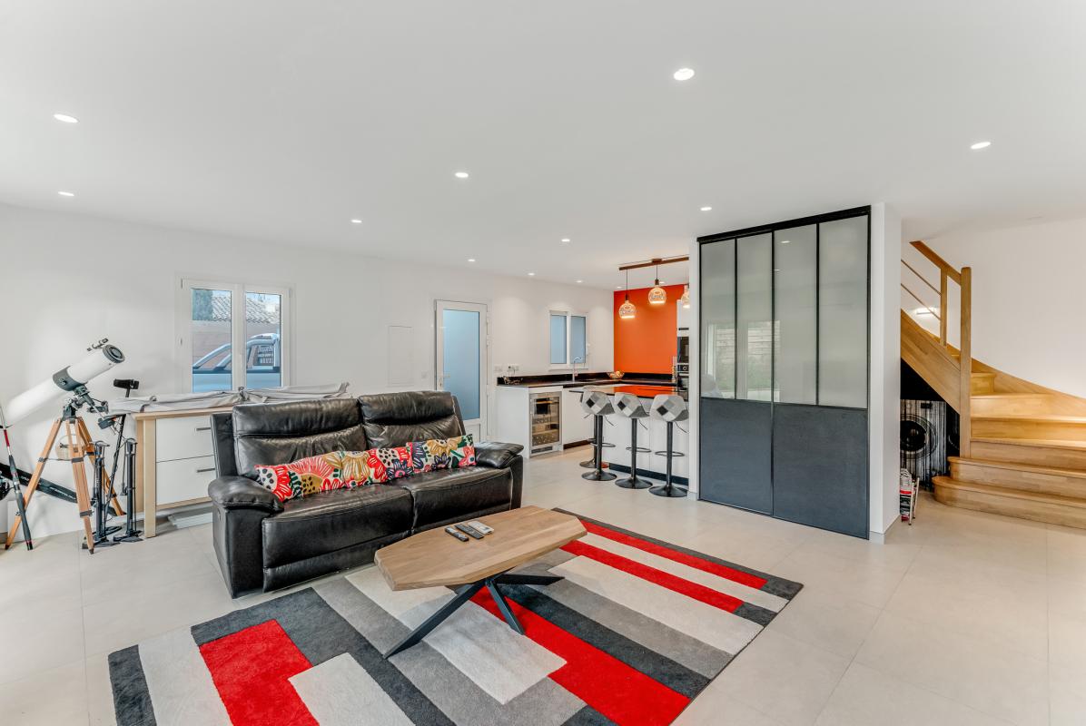 De plain-pied, la villa s'ouvre sur un vaste séjour lumineux avec salle à manger, agrémenté de grandes baies vitrées et d'une belle hauteur sous plafond, ainsi qu'une cuisine entièrement équipée donnant sur une terrasse extérieure.