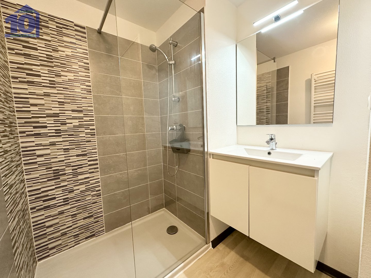 À l'étage, l'espace nuit propose une chambre avec rangements intégrés, ainsi qu'une salle d'eau contemporaine équipée d'une douche à l'italienne.