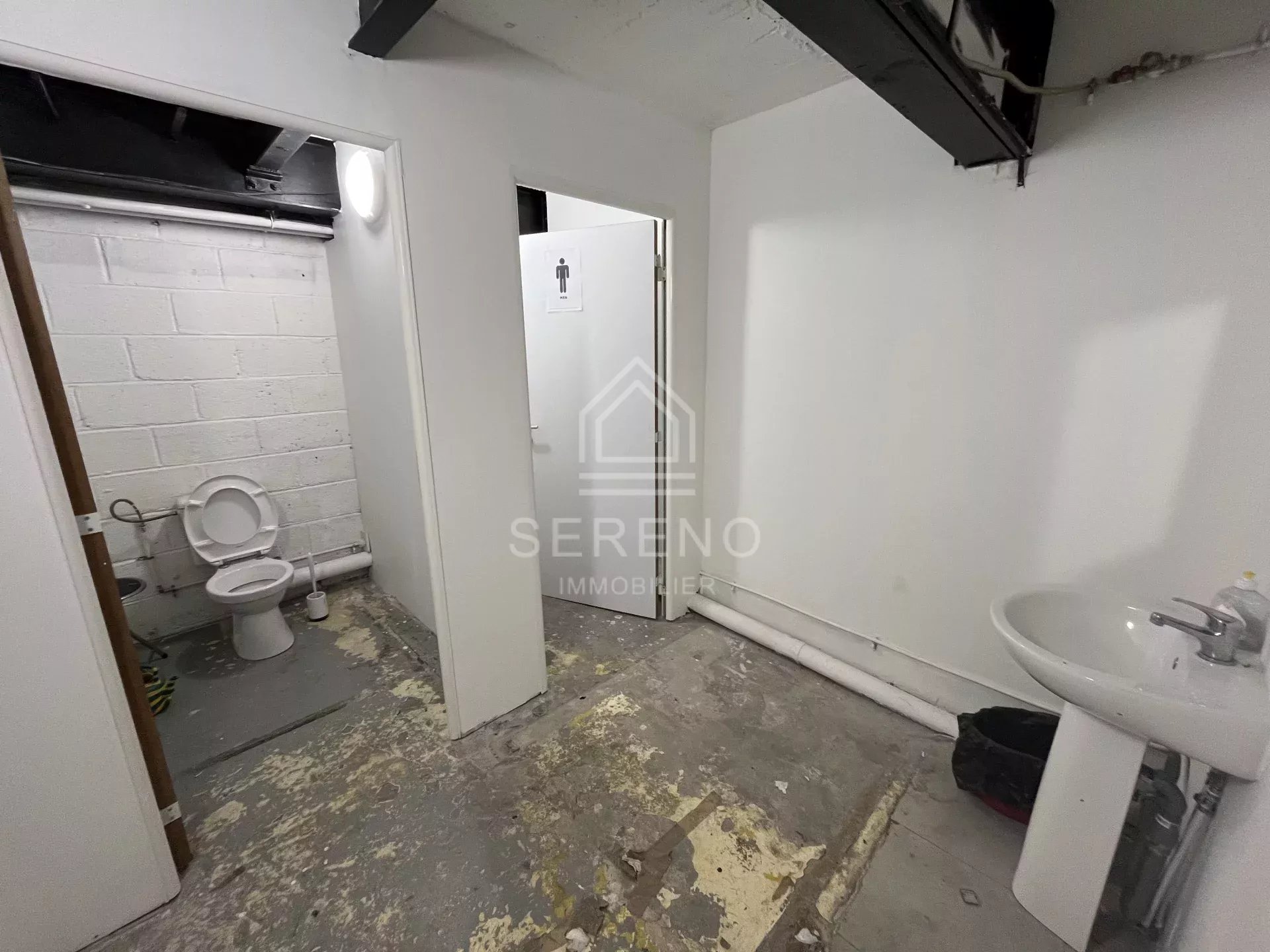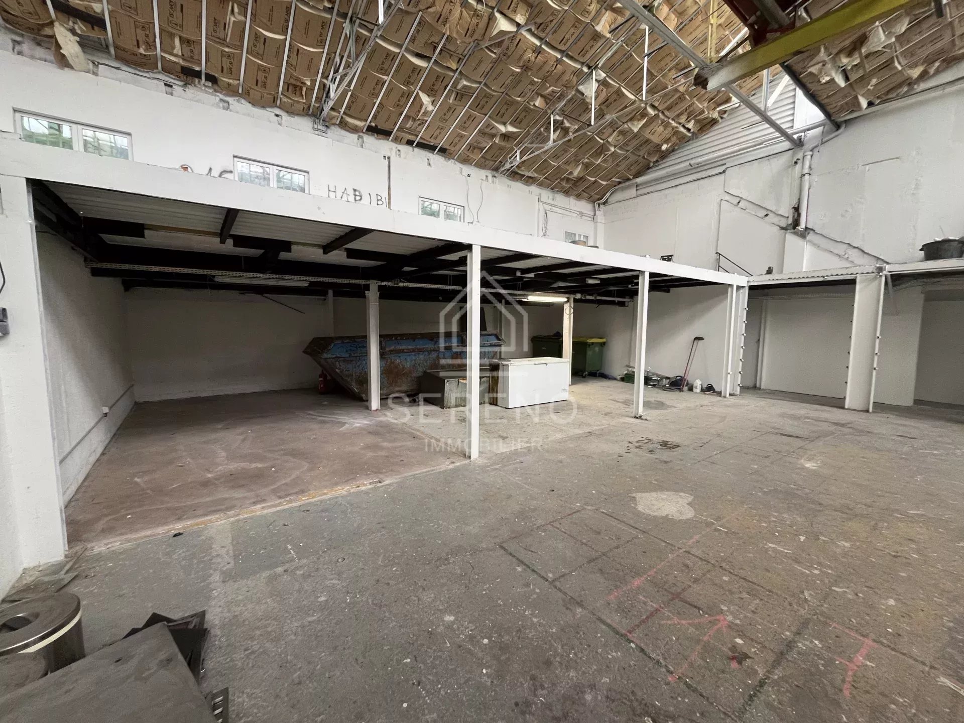 Un entrepôt avec entrée camion très grande hauteur sous plafond (jusqu'à 8m au faitage) avec bureaux, mezzanines, atelier, cuisine et sanitaires.