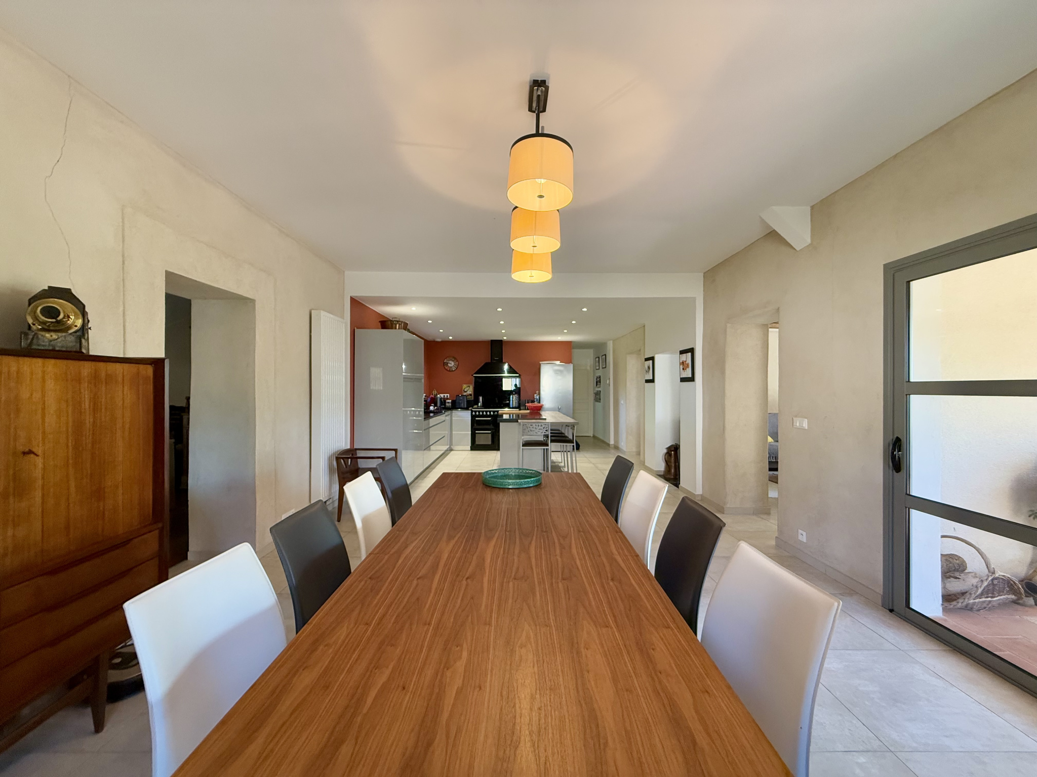Dès l'entrée, vous serez conquis par le vaste salon baigné de lumière, agrémenté d'une élégante cheminée double face, créant une atmosphère chaleureuse et conviviale.