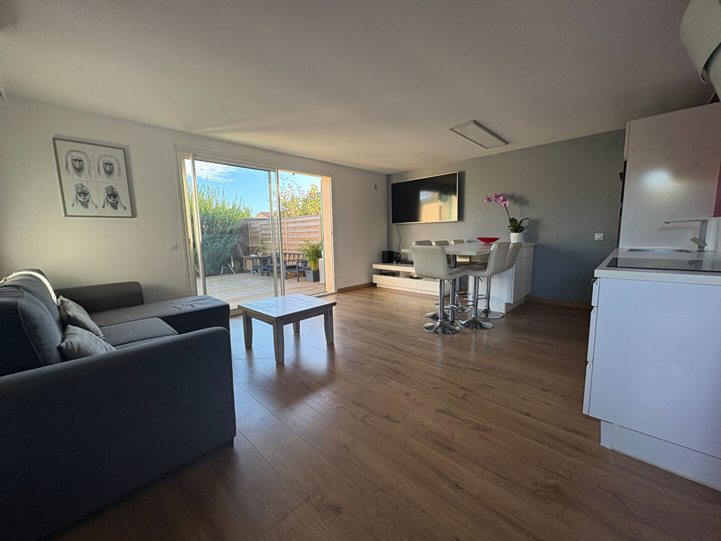 Agréable et lumineuse pièce de vie avec sa cuisine entièrement équipée et aménagée donnant sur une belle terrasse en bois et d'un agréable espace extérieur intimiste, idéal pour profiter des beaux jours, puis 2 chambres, une salle d'eau, un wc indépendant. Un dégagement avec placard. Climatisation. Maison en très bon état. Un cabanon de rangement. Fibre.