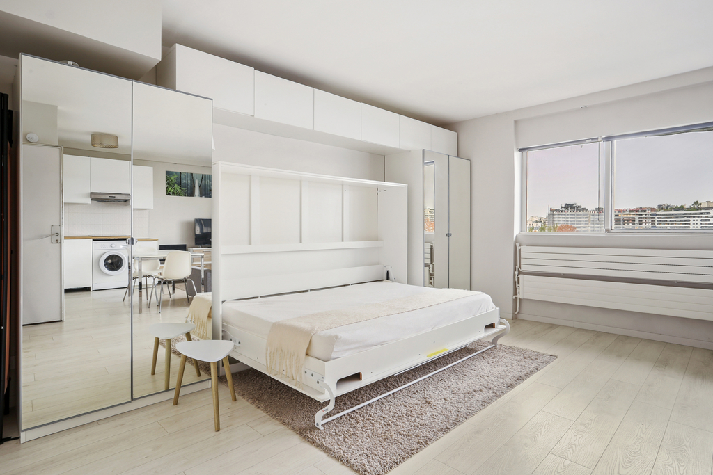Dans une tour très bien entretenue, sécurisée et avec service de réception 24h/24. Il se compose comme suit : une pièce de vie avec cuisine entièrement équipée, une salle d'eau avec toilettes, et dispose de nombreux rangements conçus sur mesure, dont un grand lit escamotable.