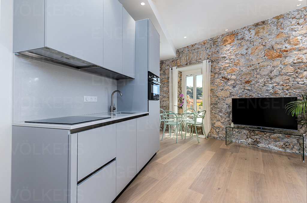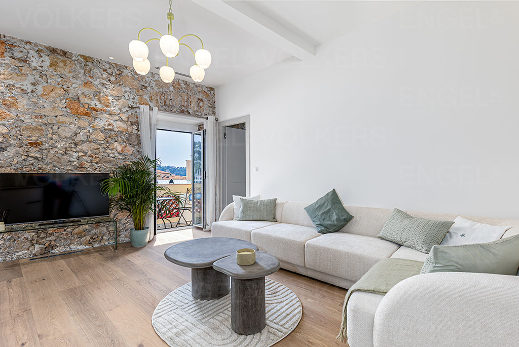 La pièce à vivre intègre une cuisine pratique et fonctionnelle, un coin repas devant une fenêtre avec garde-corps en verre pour apporter une belle luminosité et profiter de la vue. Une baie vitrée donne accès un balcon aménagé avec une table ronde pour se plonger dans l'atmosphère de la place et admirer la vue. On admire depuis ce balcon les bateaux ancrés au fond de la rade et la chapelle Saint Pierre, véritable joyau culturel décorée par Jean Cocteau.