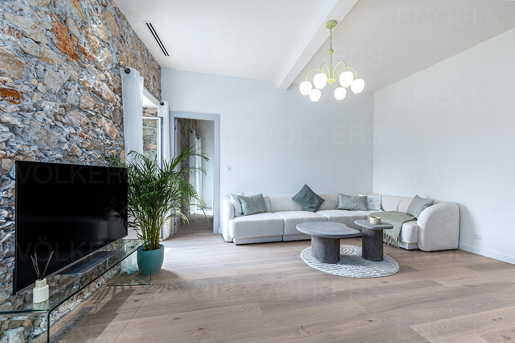 Ce couloir donne accès par un escalier typique des maisons de pécheurs à l'étage où l'on découvre une pièce à vivre baignée de lumière alliant le charme de la pierre ancienne apparente avec la chaleur du parquet en bois. La rénovation reflète un raffinement qui se traduit par le choix des matériaux, du mobilier, des couleurs, des luminaires ainsi que dans le détail des finitions.