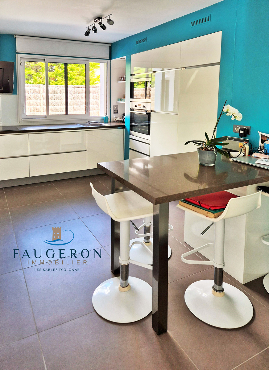 Proche du Golf de Bourgenay et de la pinède - Villa de 120 m2 hab. parfaitement entretenue, confortable et fonctionnelle : salon/séjour avec cheminée, 4 chambres dont 2 en RdC, SdB & SdE, terrasses et piscine chauffée à l'abri des regards + grand garage et stationnements sur espaces paysager de plus de 1100 m2. Architecture traditionelle vendéenne de bord de mer, proche des loisirs et commerces