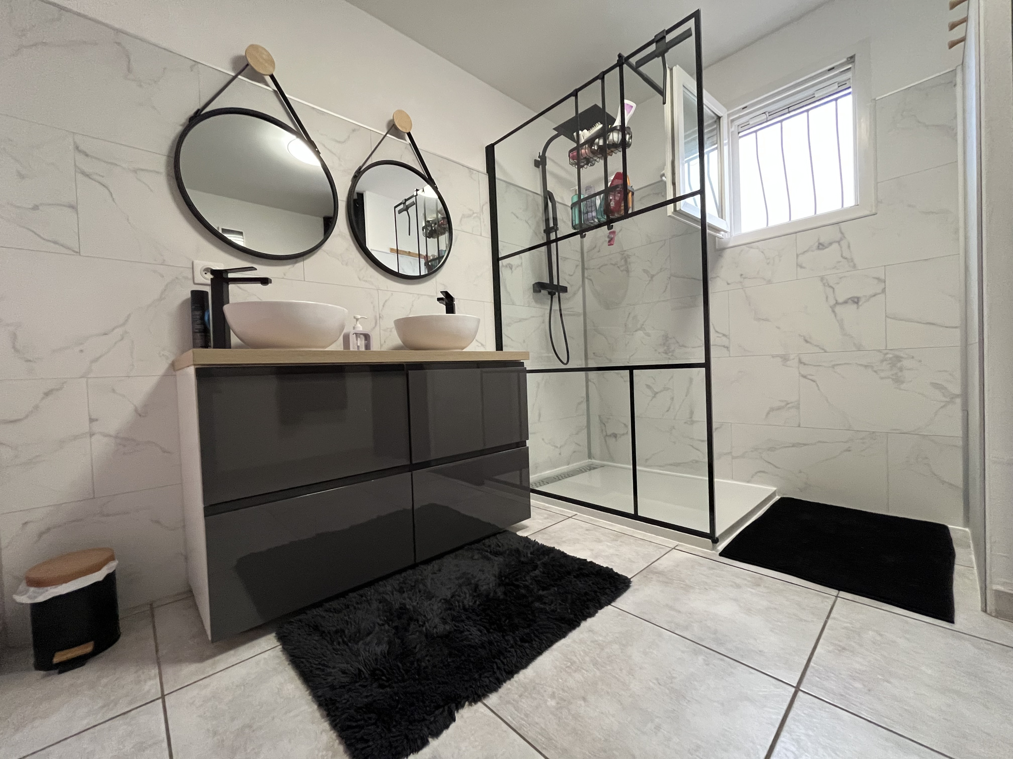 Une grande salle d'eau avec douche à l'italienne et double vasque avec un second WC.
