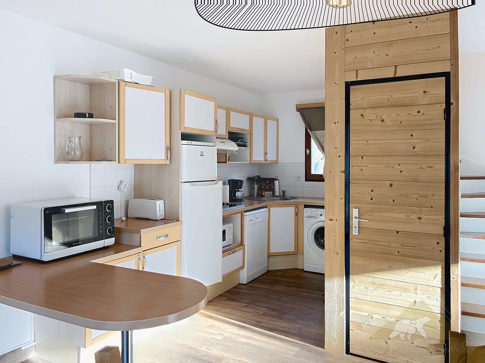 Le bois vieilli, les tons chaleureux et la cuisine entièrement aménagée et ouverte sur le séjour composent une atmosphère où l'on se sent immédiatement chez soi.
