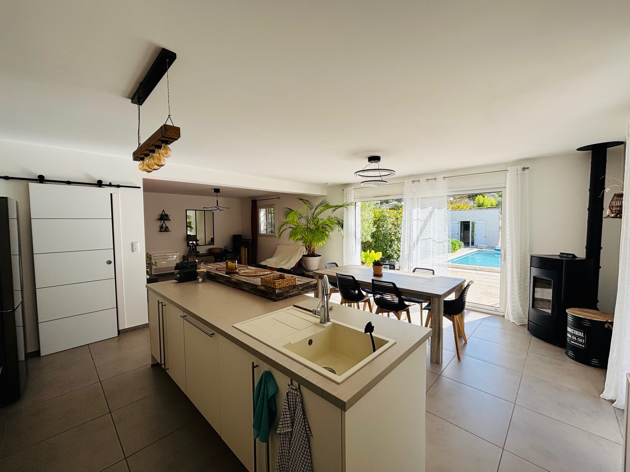 Rez-de-chaussée : Vaste pièce de vie baignée de lumière avec cuisine américaine équipée - Accès direct à la terrasse et à l'espace piscine - Cellier pratique - WC indépendant
