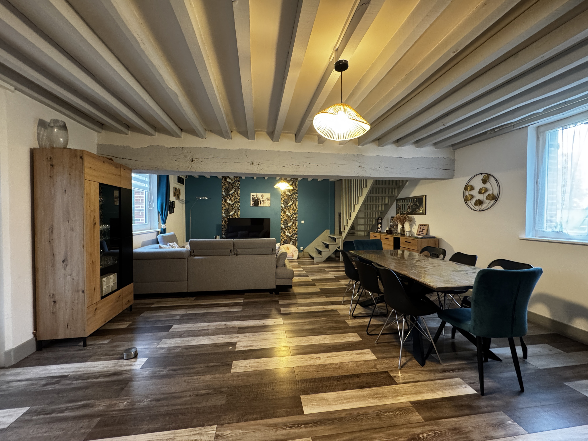 - au rez-de-chaussée : entrée sous véranda, salon/salle à manger de 39 m2 avec poêle à bois et poutres, cuisine aménagée et équipée (four, micro-onde, four, hotte, plaque), salle de bains avec W.C. ;