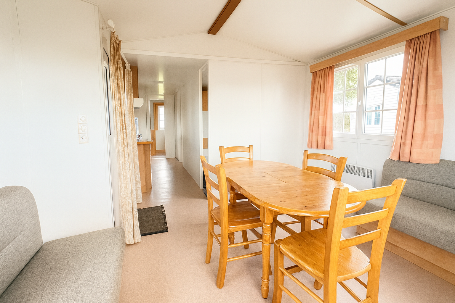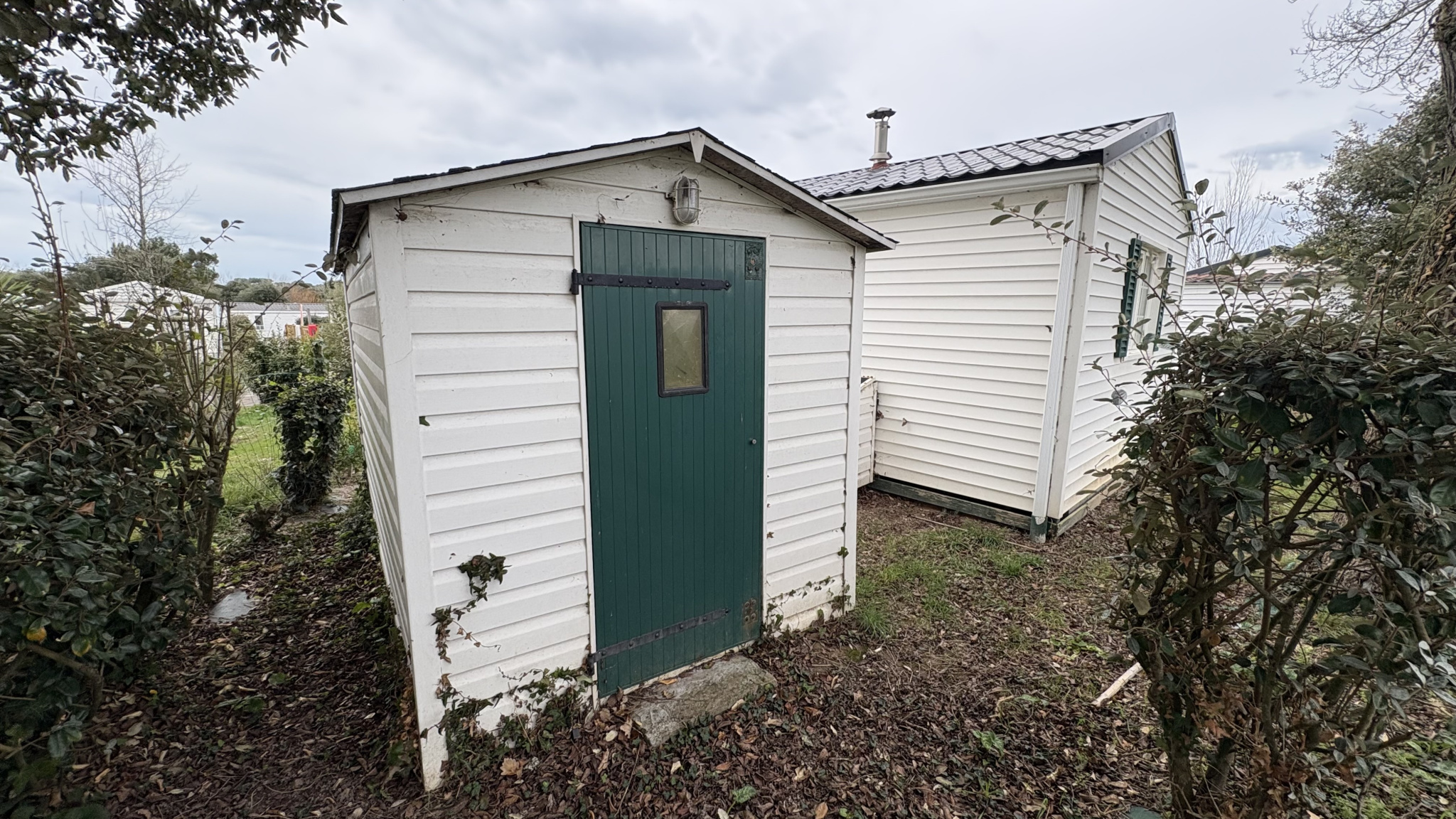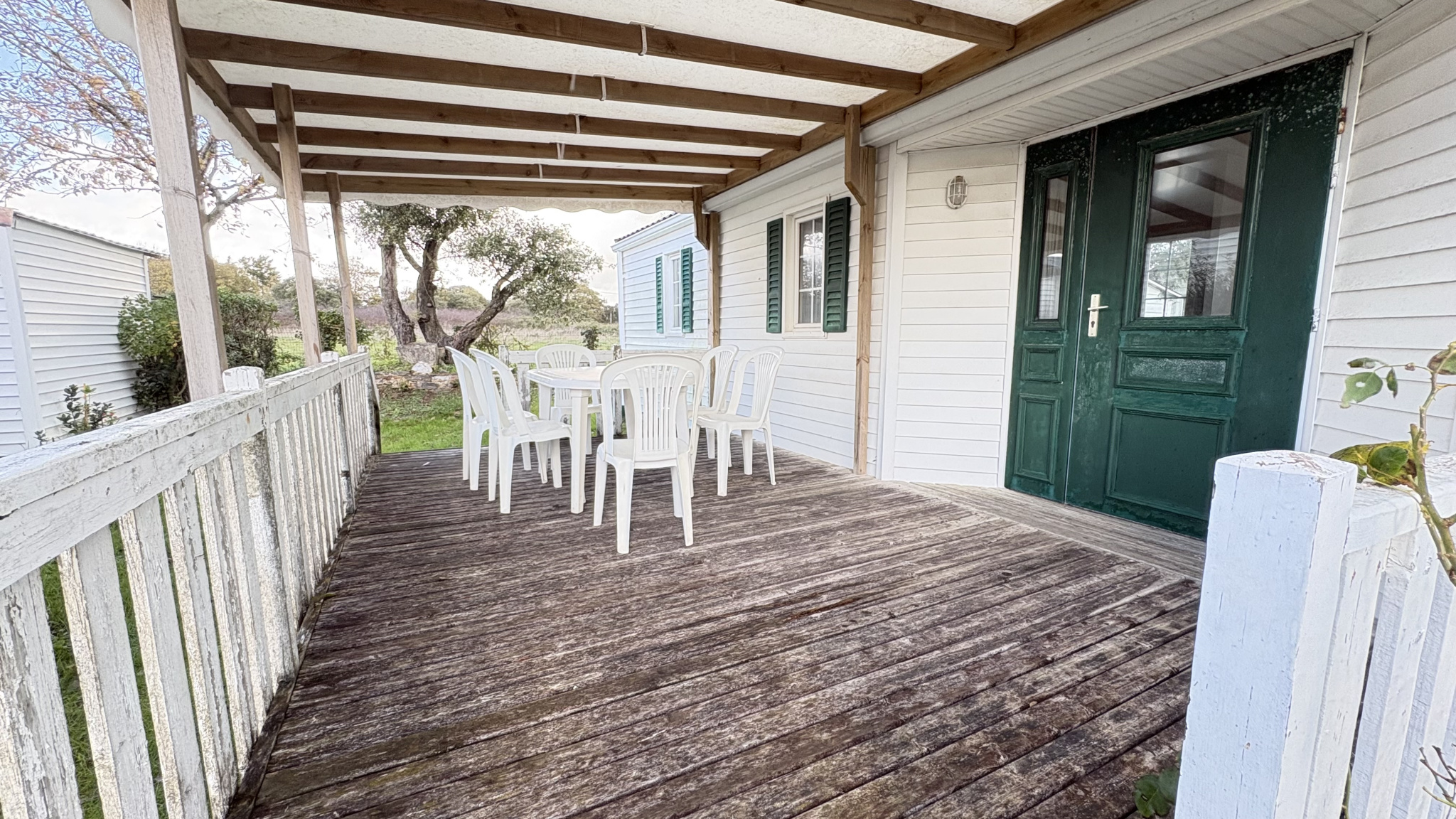 2 chambres, une grande pièce de vie, cuisine, salle d'eau, wc, terrasse en bois couverte et un abri de jardin.