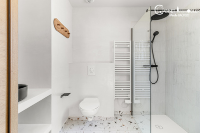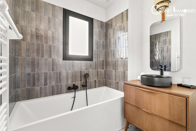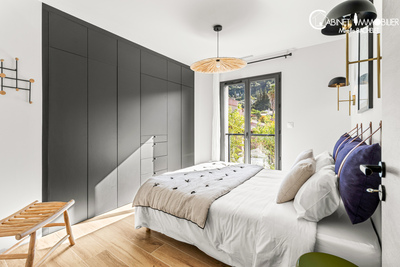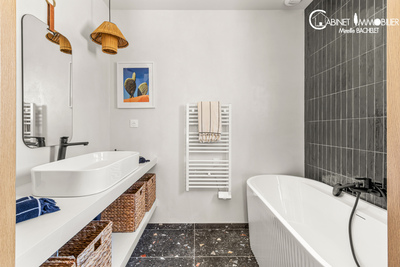 Au rez de chaussée: entrée, grande cuisine neuve entièrement équipée ( réfrigérateur/ congélateur, plaque à induction, hôte, lave-vaisselle, cave à vin...) suivie du séjour, du salon. Espace très lumineux ensoleillé grâce à des fenêtres, baies vitrées Est, Sud, Ouest. Le séjour et le salon ouvre sur une terrasse en béton ciré suivie du jardin paysagé avec gazon, beaux arbres.. Le rez de chaussée accueille également une salle d'eau avec wc, une pièce qui peut être un bureau ou toute autre pièce.