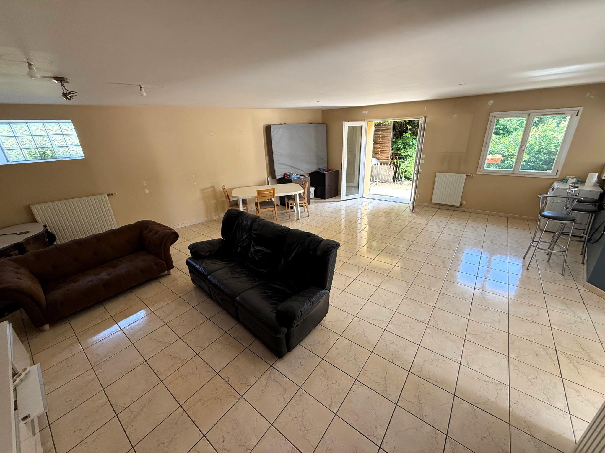 Au rez-de-chaussée, profitez d'une vaste pièce de vie de 59 m2 avec cuisine ouverte, donnant accés à une belle terrasse d'environ 37 m2 sans vis à vis et à un jardin privatif de 558 m2, parfait pour vos moments de détente en extérieur.