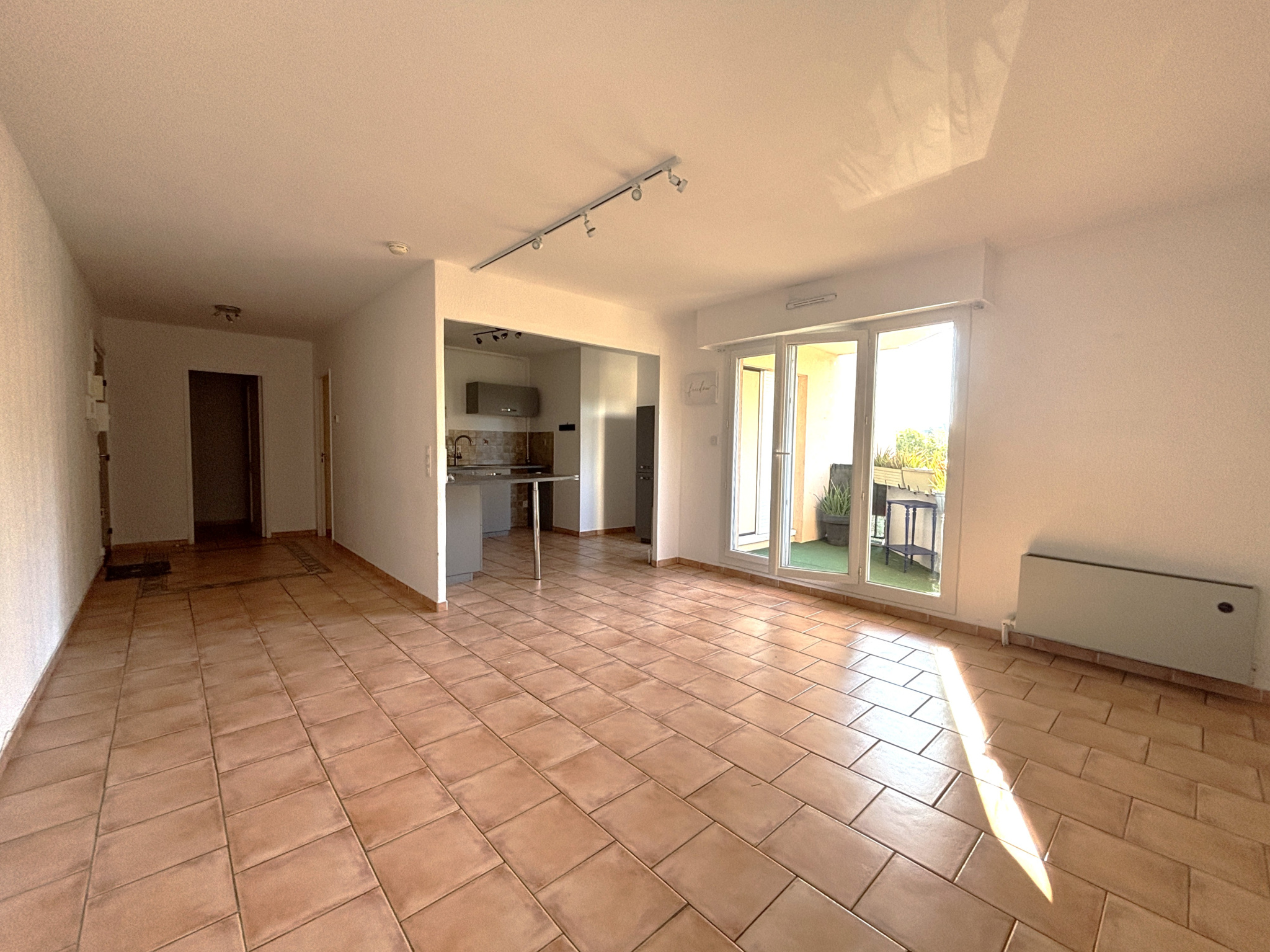 L'appartement se compose d'une grande entrée, d'une pièce de vie avec cuisine aménagée et équipée ouverte, donnant accès à un balcon commun au salon, à la cuisine et à l'une des chambres.