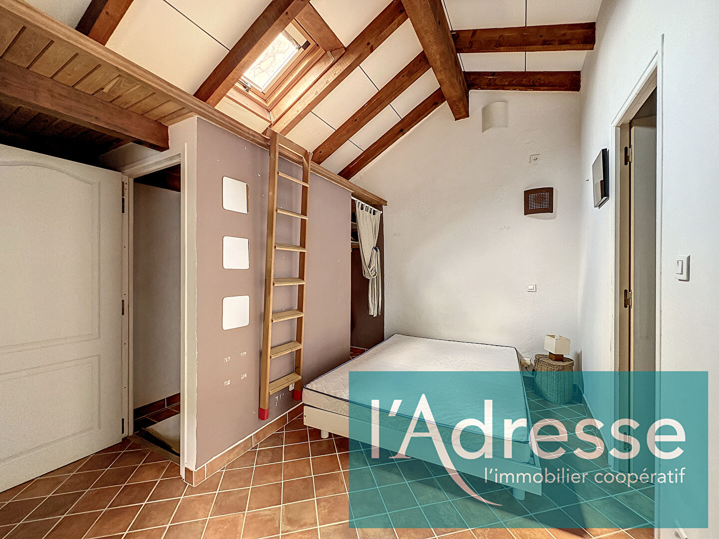 À l'étage, une chambre climatisée avec placard mural, une seconde pièce intégrant un coin nuit pouvant accueillir un lit double, une mezzanine proposant un couchage supplémentaire, ainsi qu'une salle d'eau avec WC complètent l'ensemble.