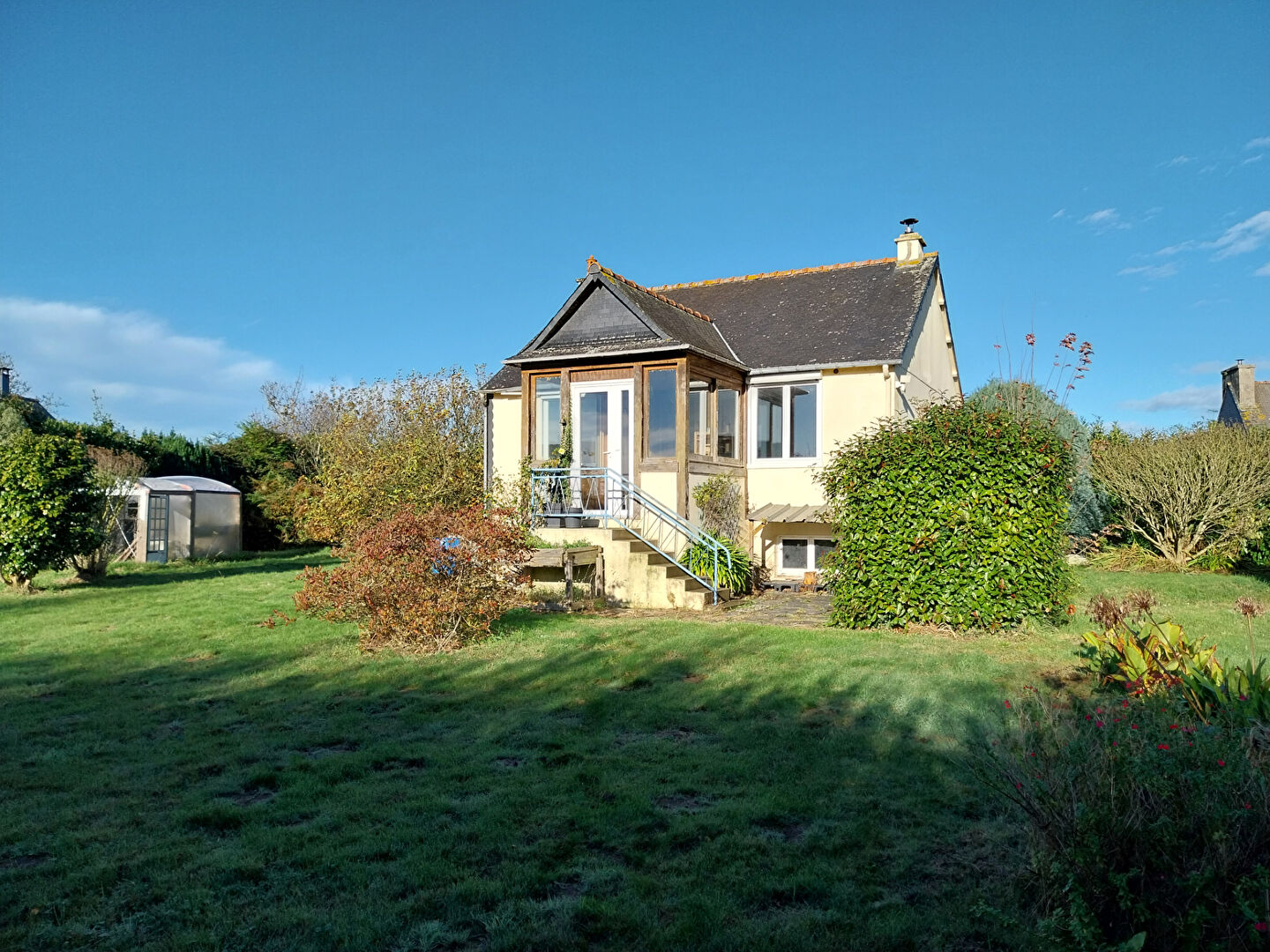 CAMLEZ - Implantée sur un magnifique jardin de 1880m² en plein centre, cette maison de plain pied élevée sur sous sol vous séduira par son environnement. Elle est composée d'une cuisine ouverte sur une pièce de vie avec un poêle à bois, deux chambres, salle d'eau avec W.C.