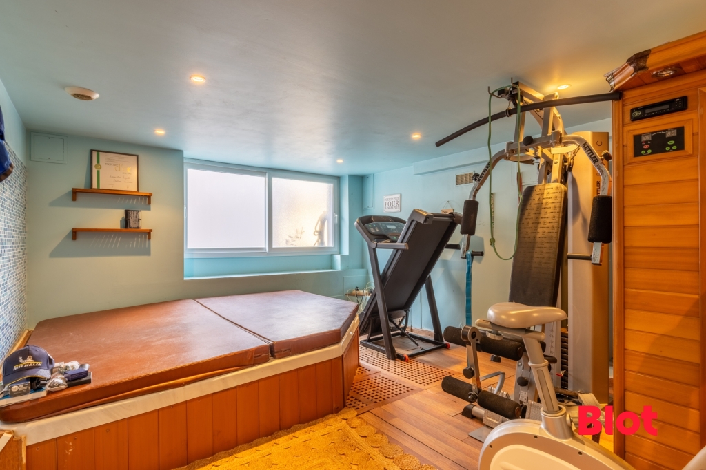 Le sous-sol aménagé devient un véritable espace bien-être : SPA, sauna, et sport, cette pièce polyvalente offre de multiples possibilités. En complément de laquelle se trouve un dégagement offrant de nombreux rangements.