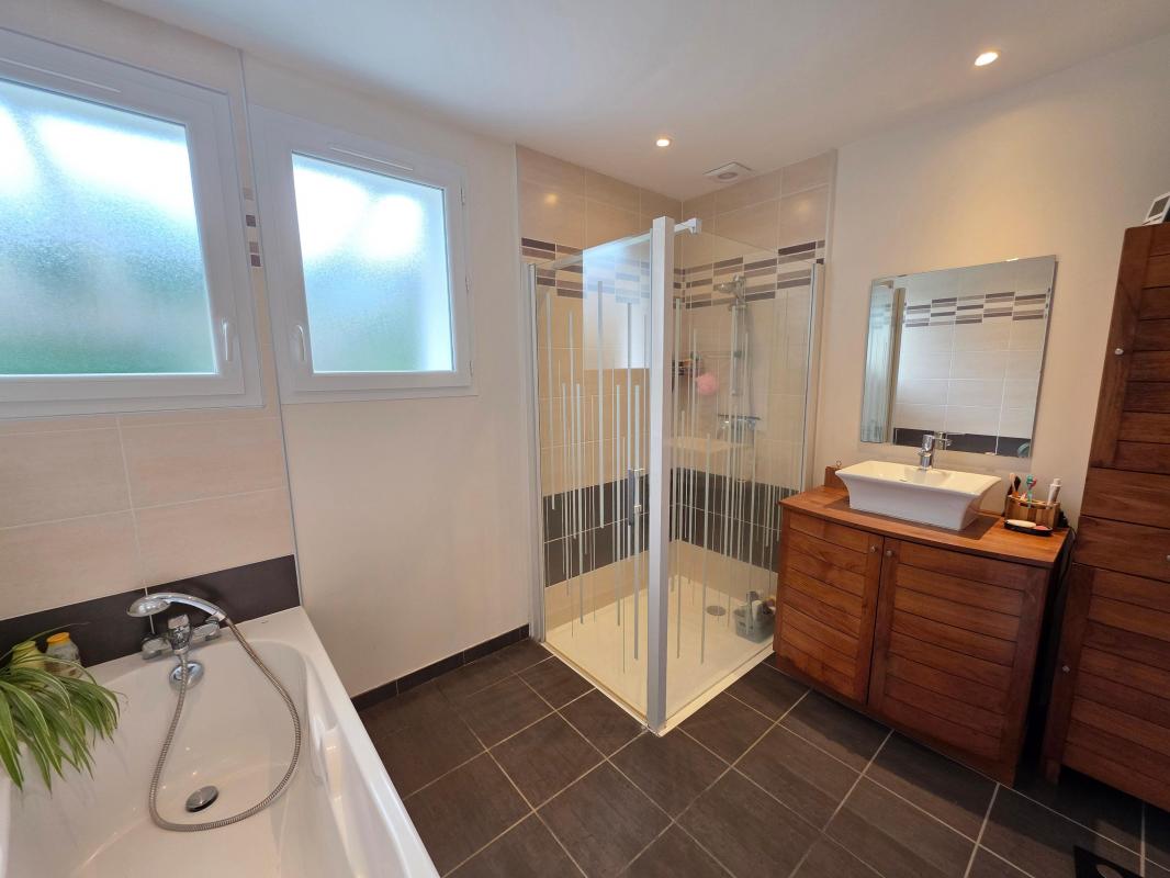 Deux terrasses généreuses prolongent les espaces de vie vers l'extérieur, permettant de profiter du terrain en toute saison. Le chauffage est assuré par une chaudière gaz complétée par un poêle à bois, et l'ensemble bénéficie du double vitrage.