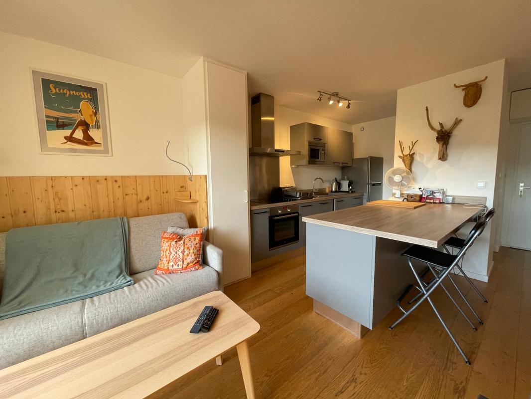 L'appartement bénéficie d'un environnement calme, tout en étant à proximité immédiate des commerces et restaurants de la station. Le stationnement est facilité grâce à un grand parking public situé face à la résidence.