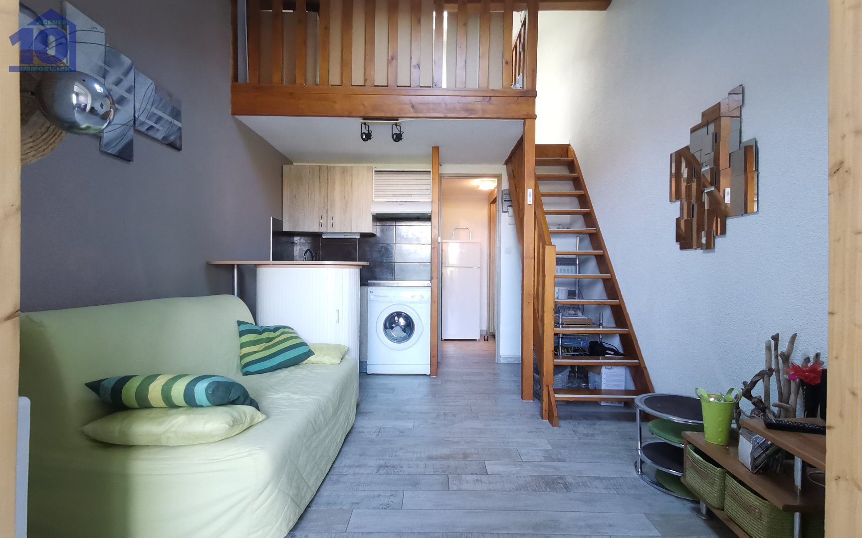 L'entrée se fait par une terrasse ensoleillée et une loggia abritée, ouvrant sur un séjour lumineux avec sa cuisine équipée moderne. Toujours au rez-de-chaussée, une salle d'eau contemporaine et un WC séparé complètent le niveau. À l'étage, une chambre spacieuse et une cabine attenante à la salle d'eau offrent un espace nuit optimisé.