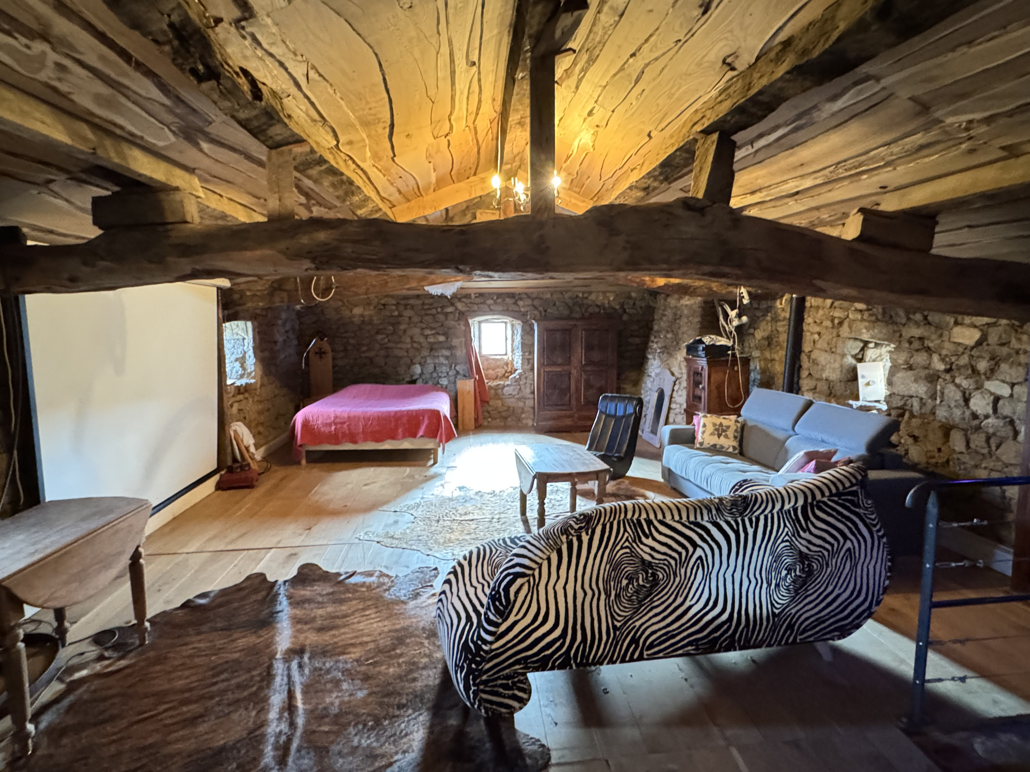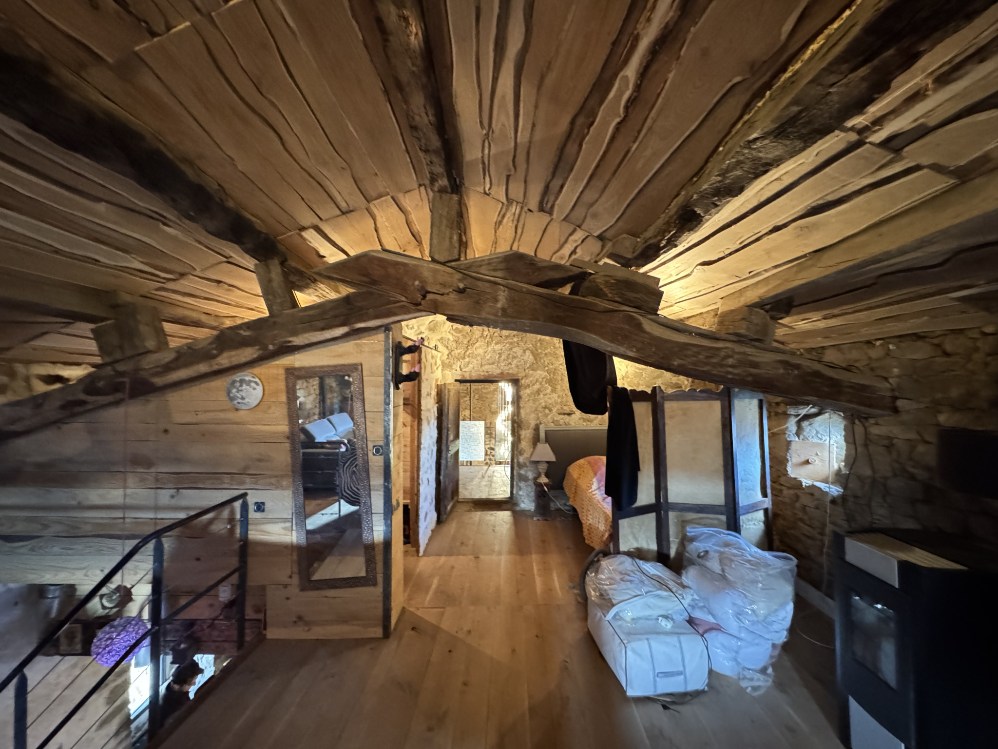 A l'étage, un grand dortoir mansardé et rustique de 66 m2 au sol offre de multiples possibilités, salon tv ou bibliothéque, coins chambres. Cette pièce dispose d'un poêle à pellets. Une mezzanine domine le séjour et une petite chambre mansardée complète cet étage.