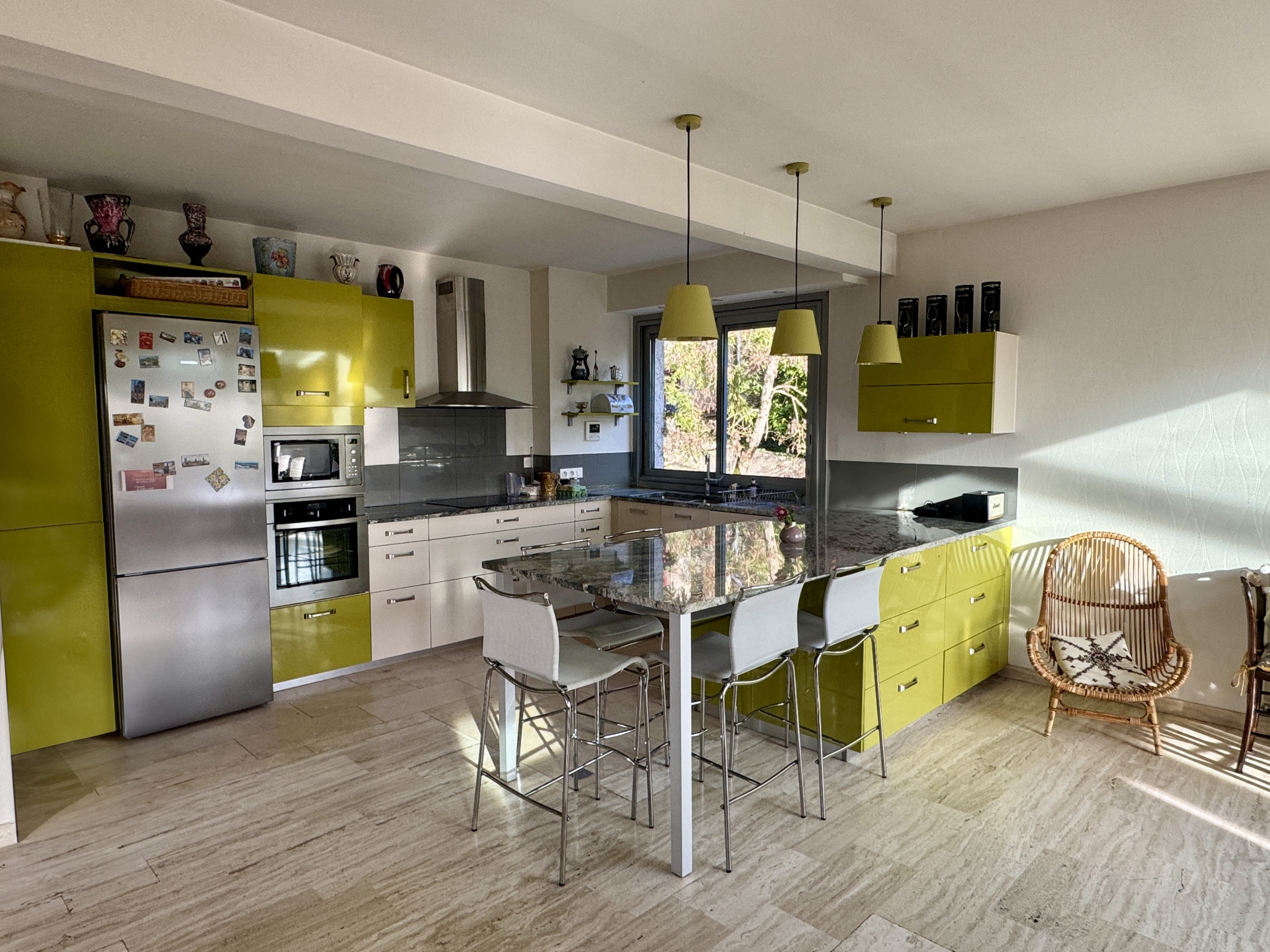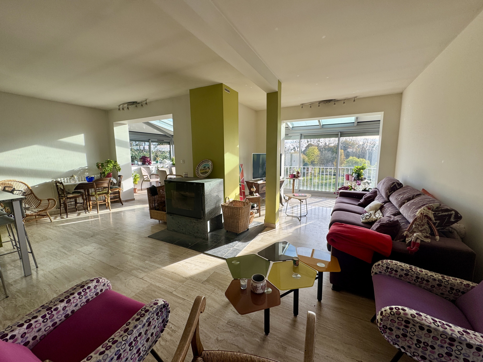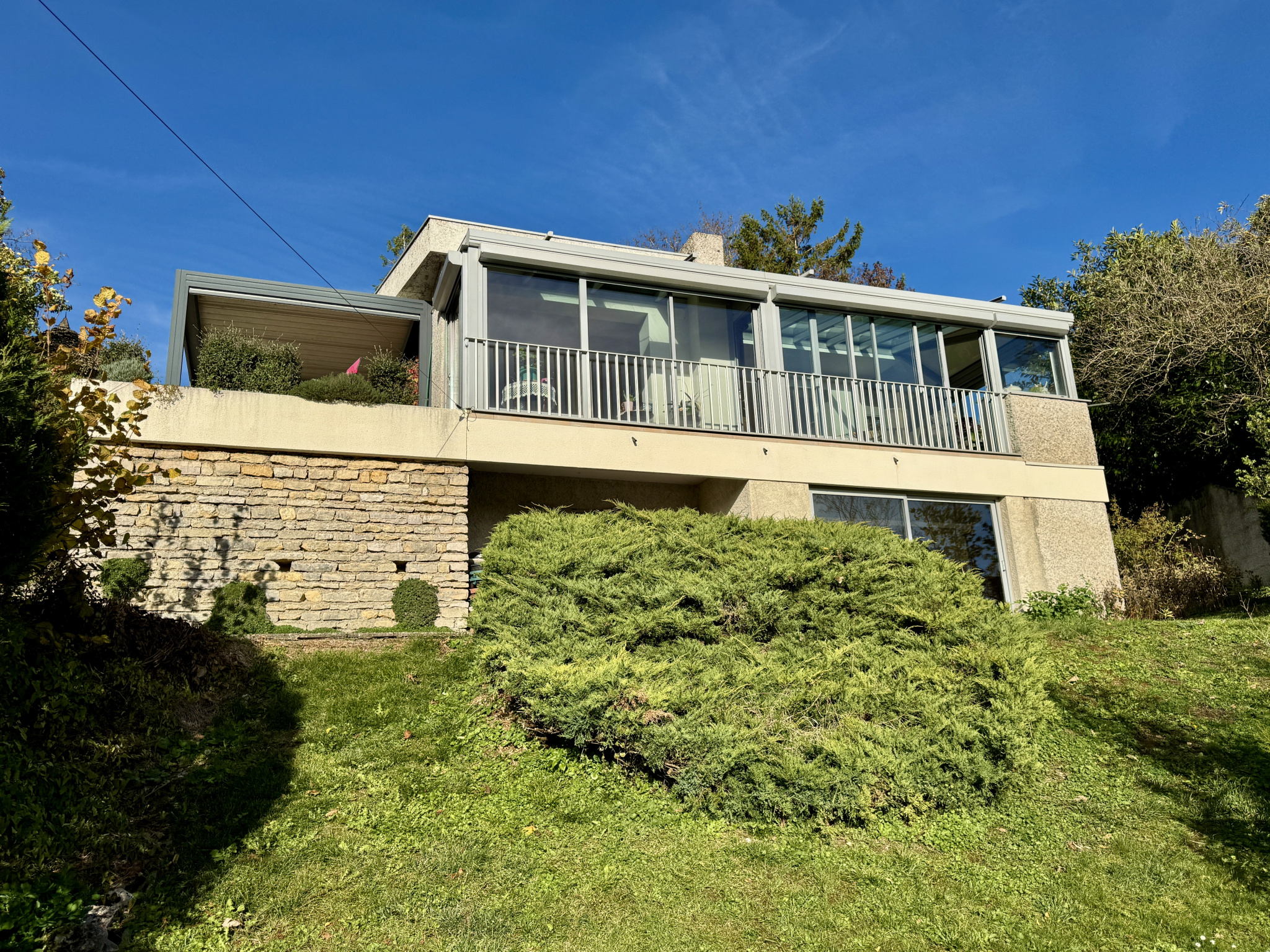 Une maison principale des années 70 toit terrasse de 194 m2 en surplomb du village, extrêmement lumineuse composée au rez de chaussée d'une pièce de vie aux volumes généreux de 74 m2 avec cuisine aménagée et équipée; les larges baies vitrées offrent une vue magnifique sur la campagne environnante, deux chambres et une salle de bain; en souplex, une chambre, une salle de douche; au même niveau, un sas dessert une salle de jeux et un grand bureau trés lumineux.