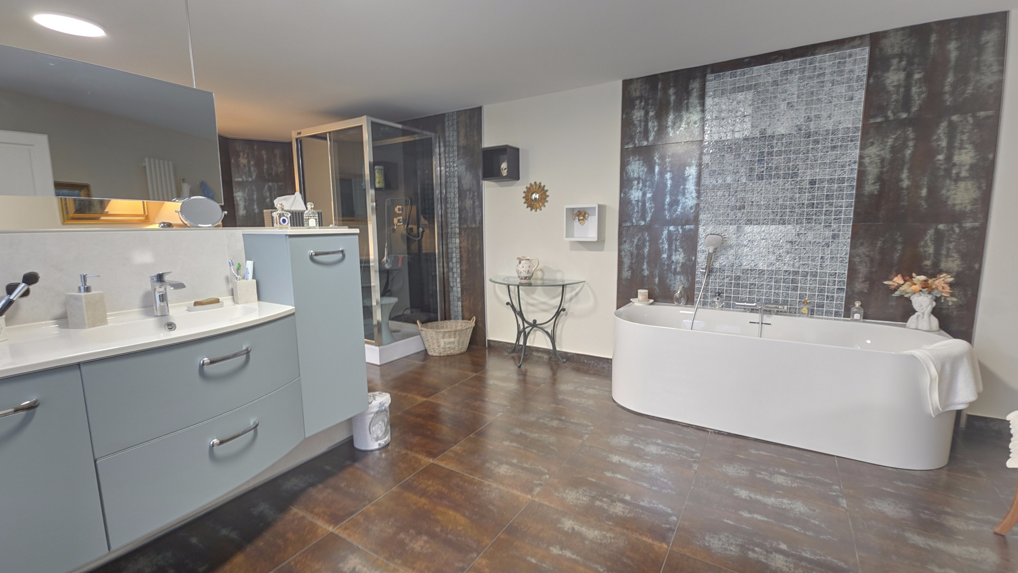 À l'étage, découvrez une pièce de vie spacieuse et lumineuse avec salon/séjour ouvrant sur terrasse, une cuisine équipée sur mesure, une salle de bains avec baignoire et douche, ainsi que trois chambres confortables.