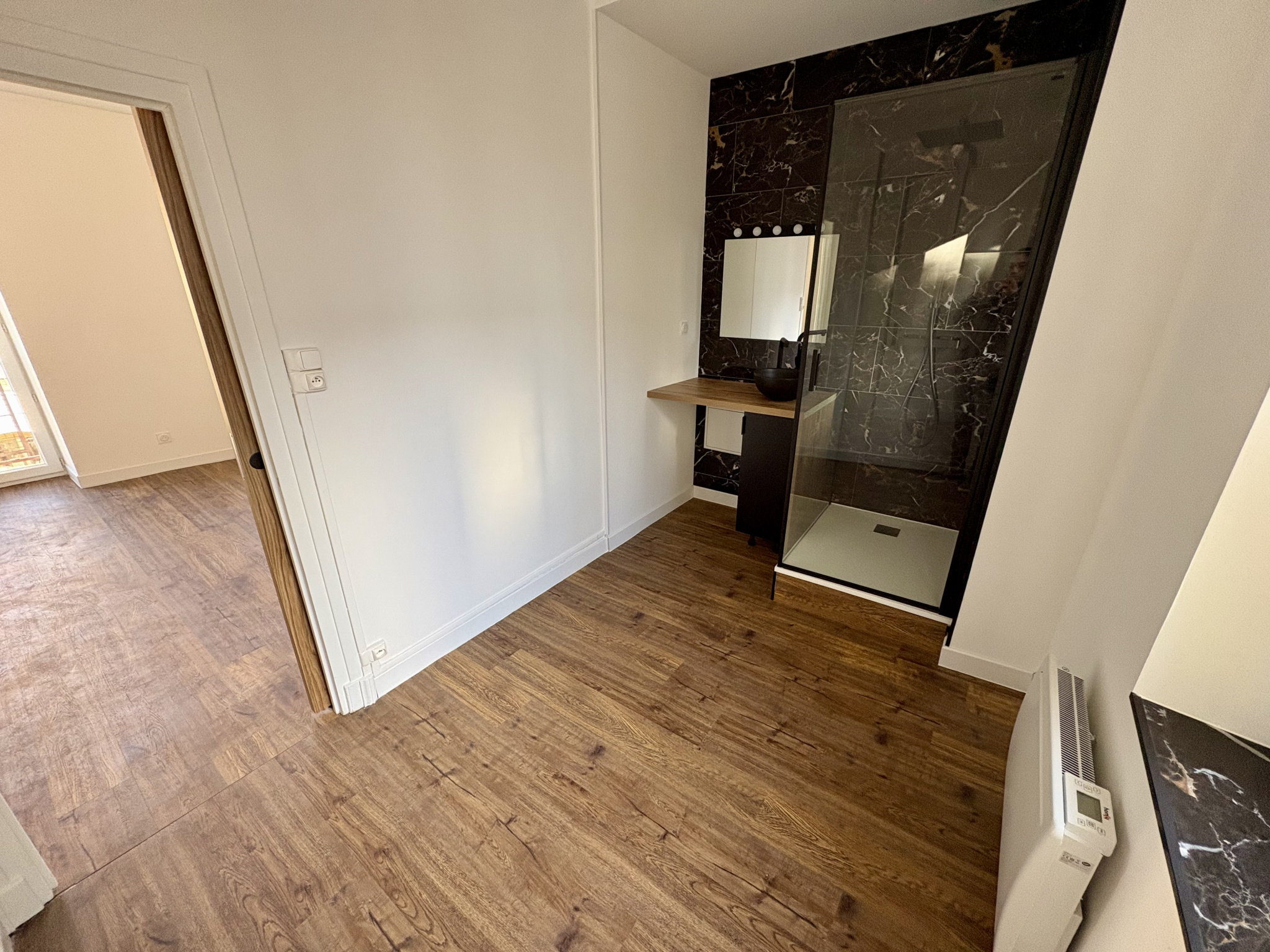 Il comprend une entrée avec placard, une cuisine entièrement équipée et aménagée (plaque, four, lave-vaisselle, réfrigérateur) ouverte sur la pièce à vivre d'une superficie totale de 16,50 m2, ainsi qu'une salle d'eau de 7,37 m2 pouvant être aménagée en espace nuit ou en dressing, un WC indépendant et une cave.