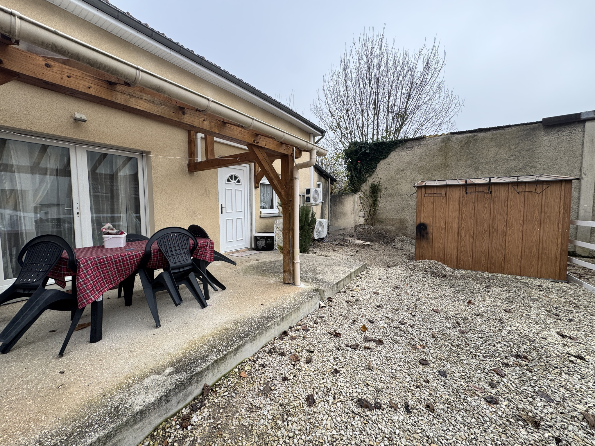 Une cour d'une surface de 66 m2 environ avec cabanon de jardin Une terrasse en partie couverte