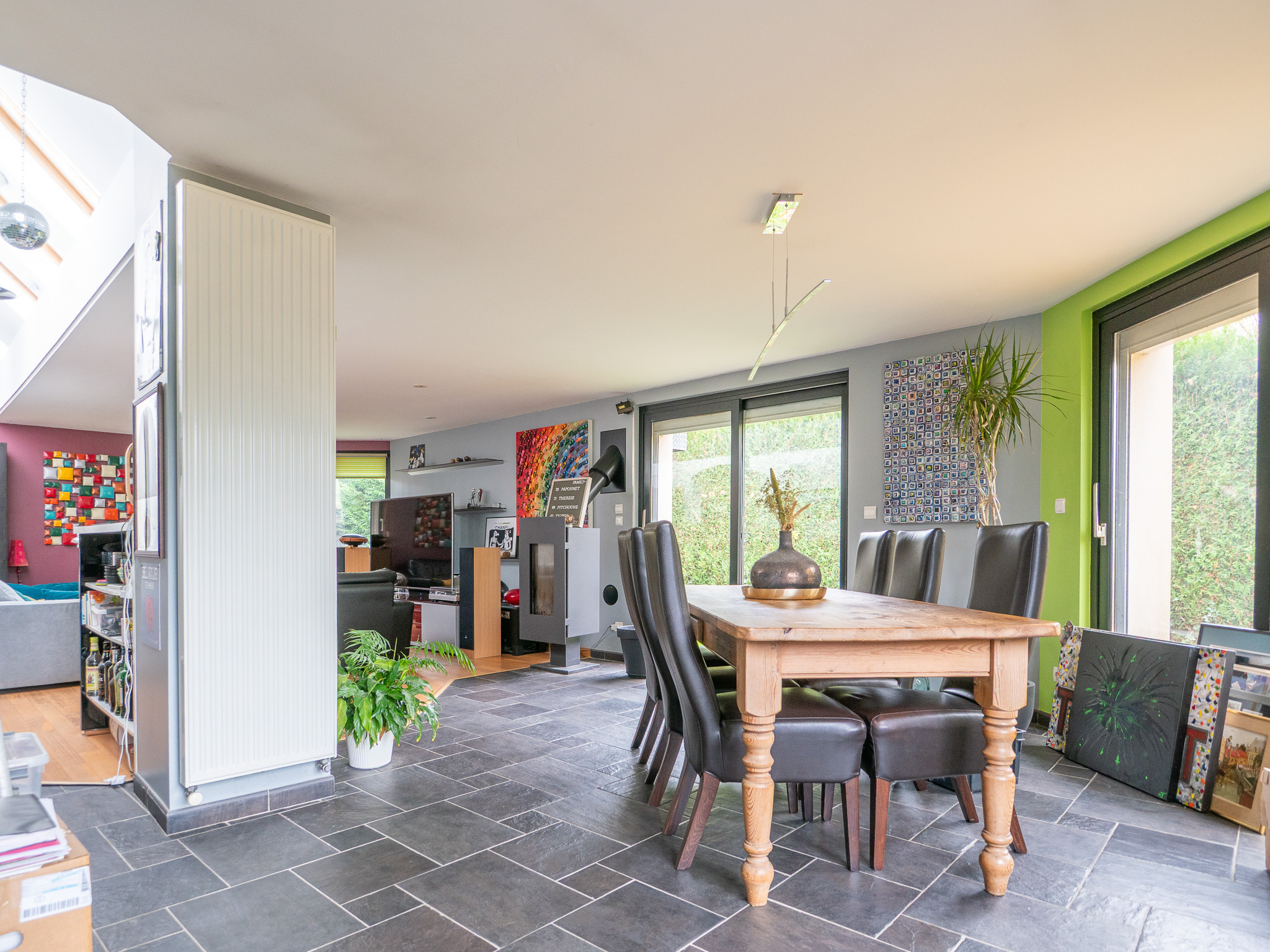 Dès l'entrée, un hall distribue une vaste salle à manger ouverte sur un premier salon chaleureux avec poêle à bois, suivi d'un second salon cosy avec cheminée feu de bois, offrant une ambiance authentique et conviviale