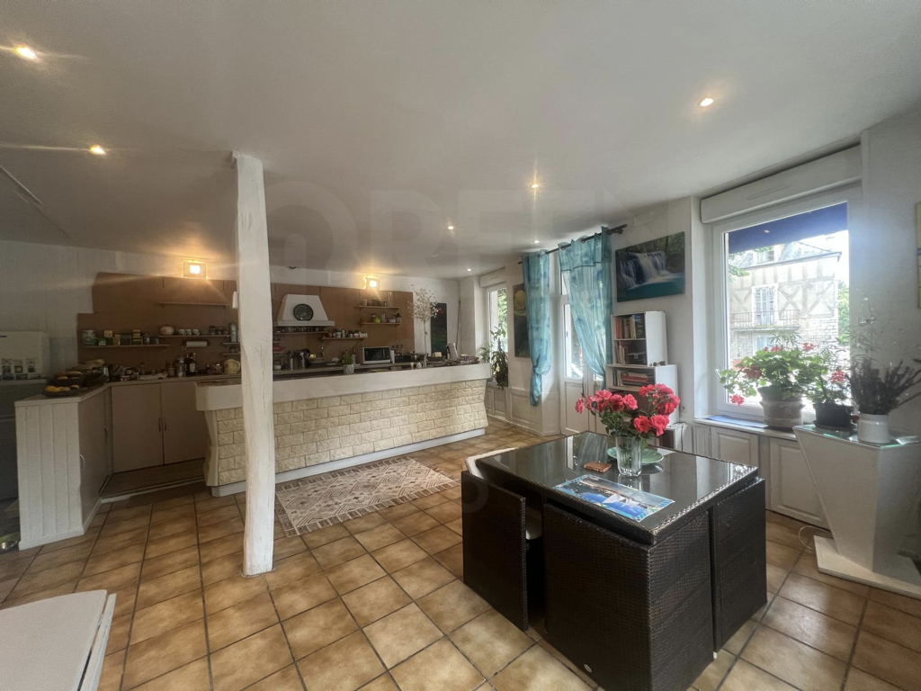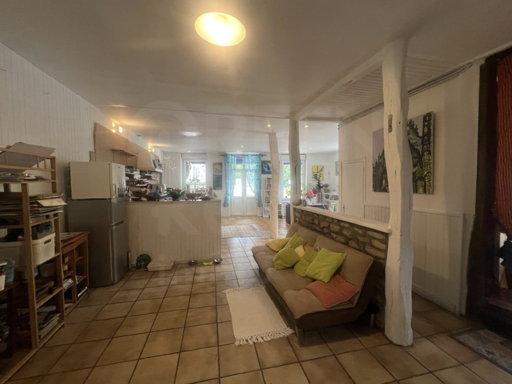 - au rez-de-chaussée : une entrée avec l'escalier vers le 1er étage, une grande pièce de vie de 60 m2 avec cuisine ouverte, un salon pouvant faire office de chambre, un WC séparé.