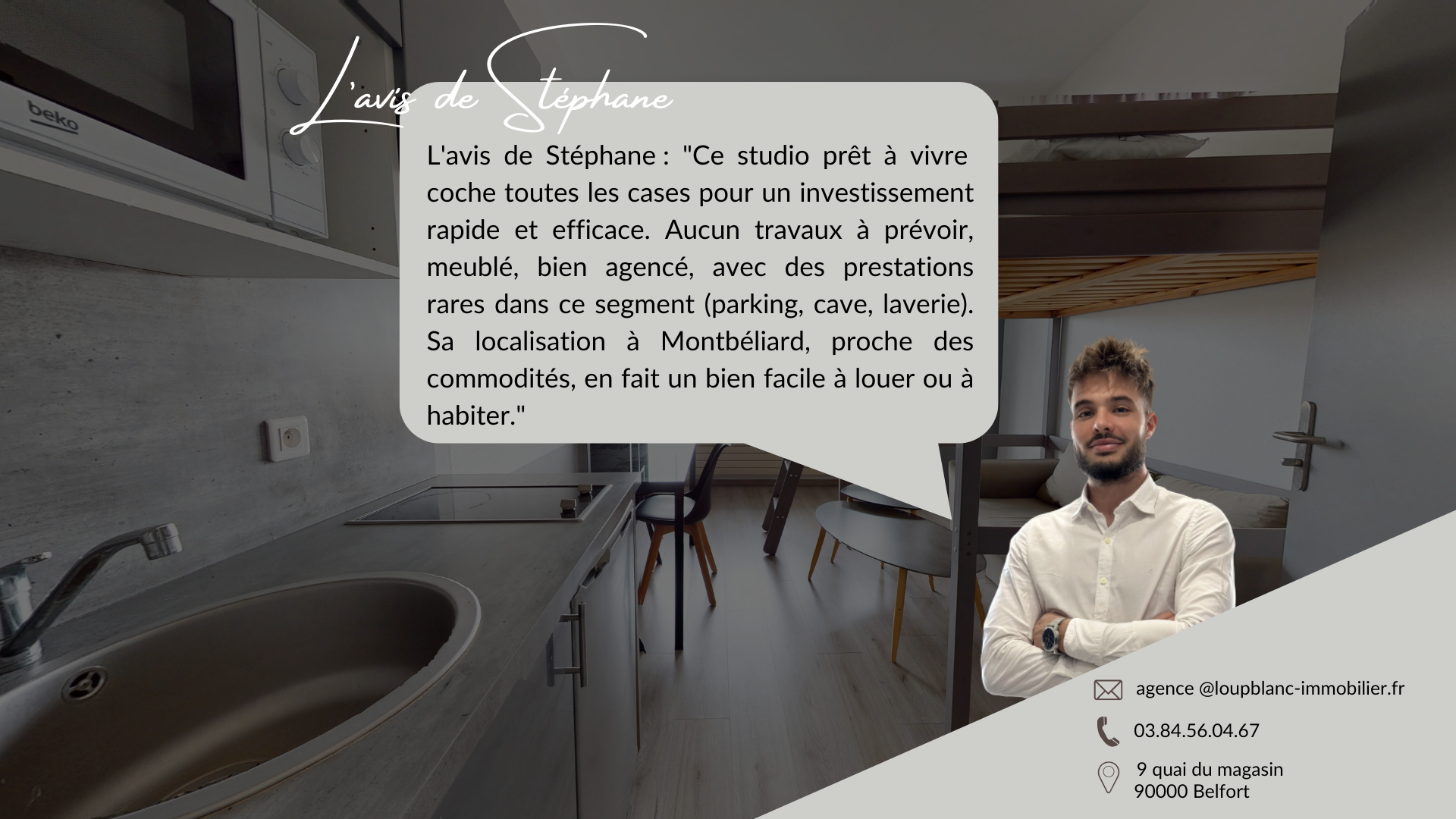 L'avis de Stéphane : 'Ce studio prêt à vivre coche toutes les cases pour un investissement rapide et efficace. Aucun travaux à prévoir, meublé, bien agencé, avec des prestations rares dans ce segment (parking, cave, laverie). Sa localisation à Montbéliard, proche des commodités, en fait un bien facile à louer ou à habiter.'