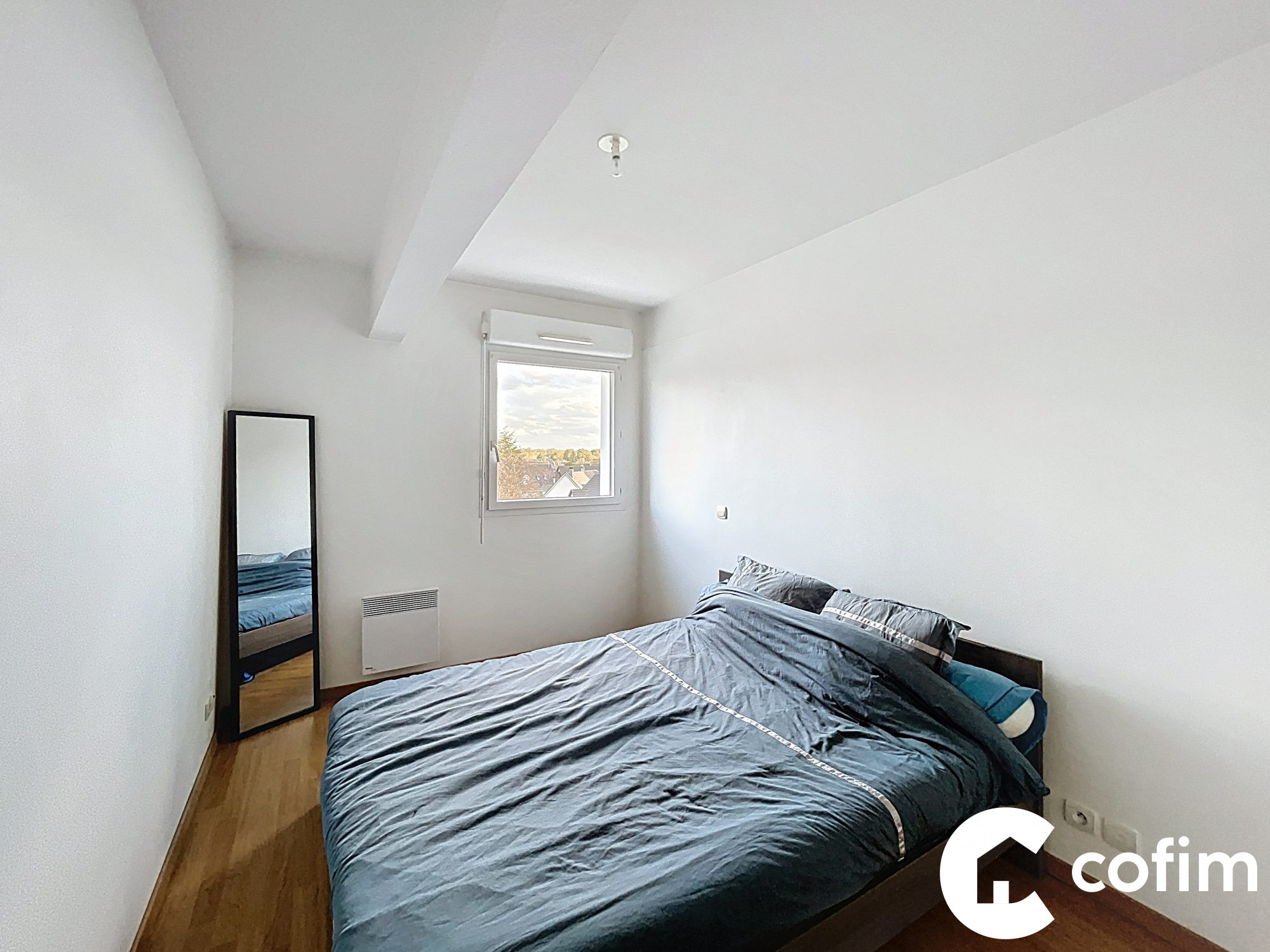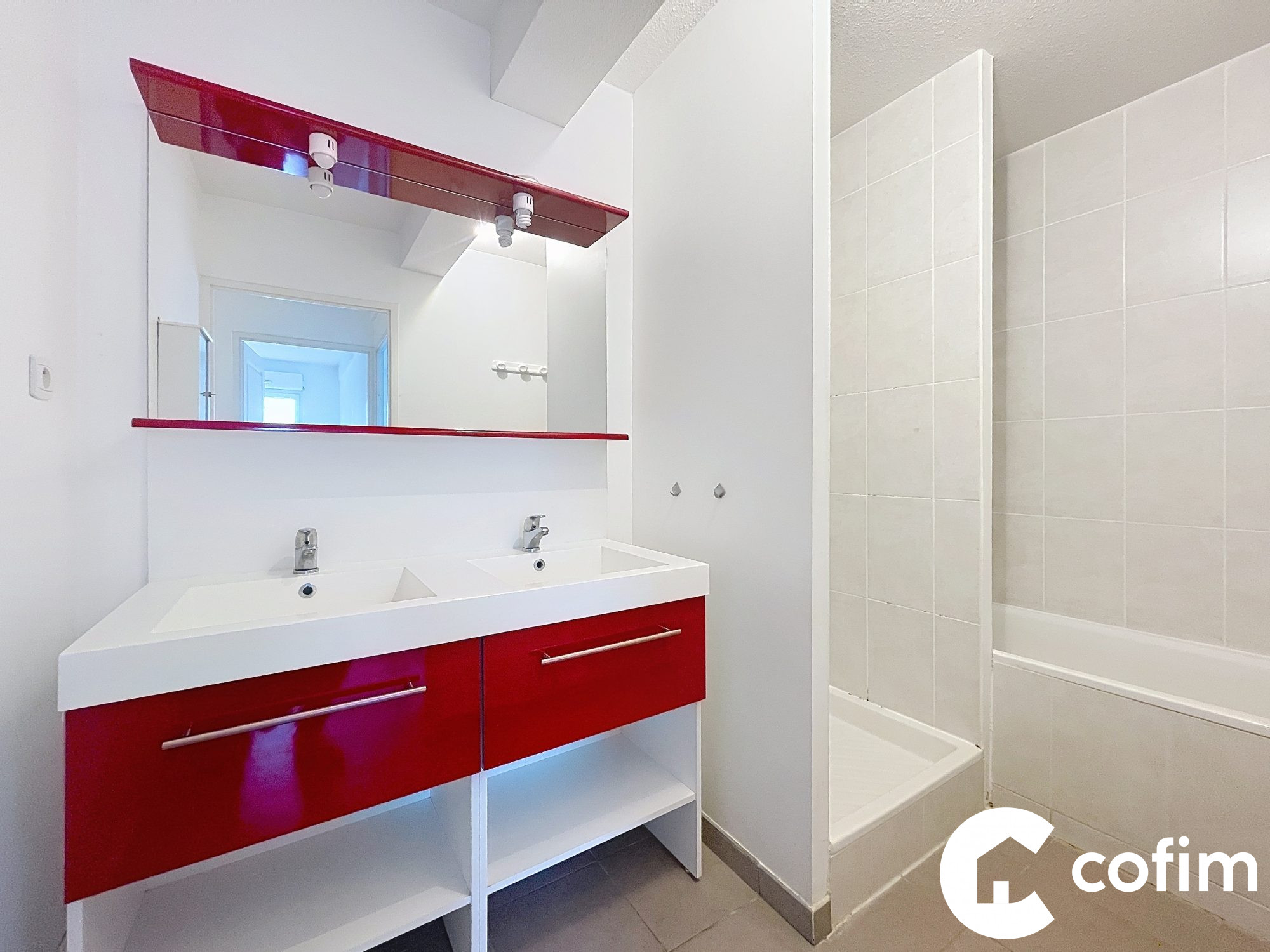 Cet appartement se compose d'une entrée, d'un espace vie avec cuisine américaine, de deux chambres avec placard, d'une salle de bains avec douche et baignoire et d'un WC indépendant.