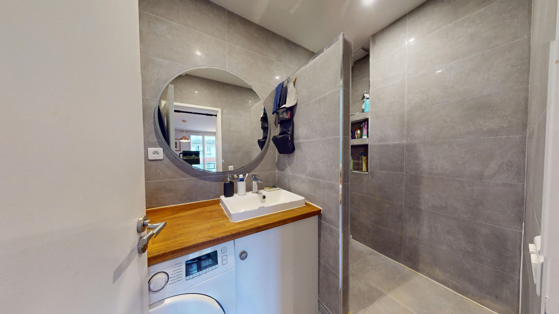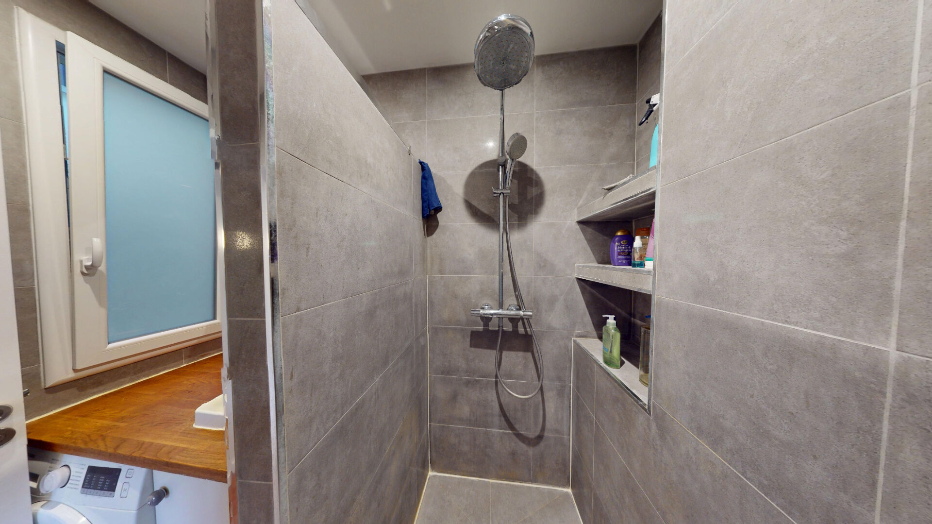 Salle d'eau moderne, entièrement carrelée, avec grande douche, chose suffisamment rare pouyr être mentionnée, une fenêtre pour l'aération et la lumière naturelle ainsi qu'une arrivée/évacuation pour machine à laver.