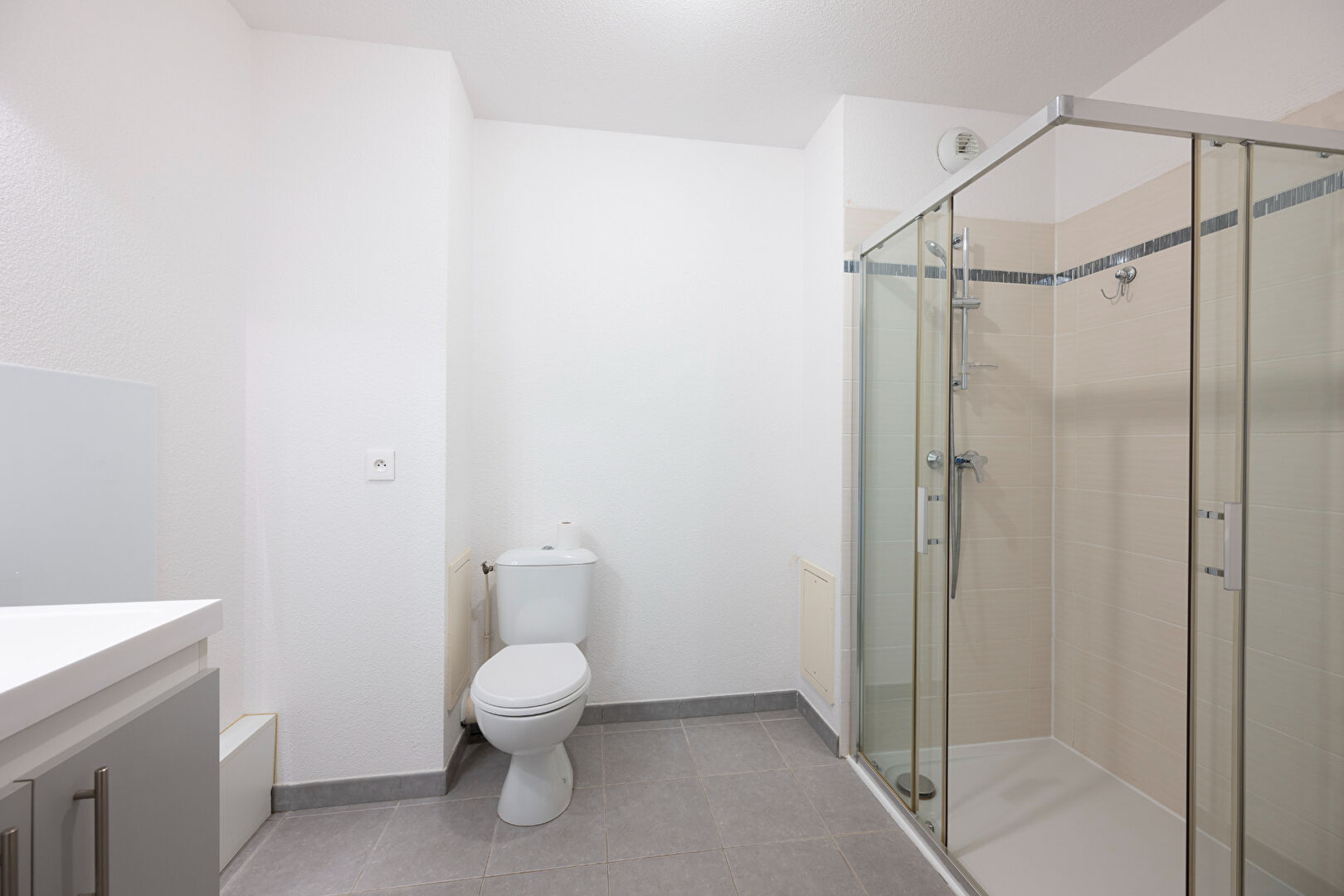 La partie salle d'eau + WC est spacieuse et pratique.