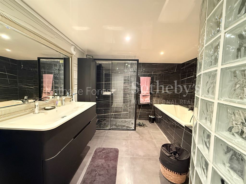 L’entrée dessert un espace buanderie, une salle de bain complète avec baignoire et douche à l’italienne, ainsi qu’un WC séparé.