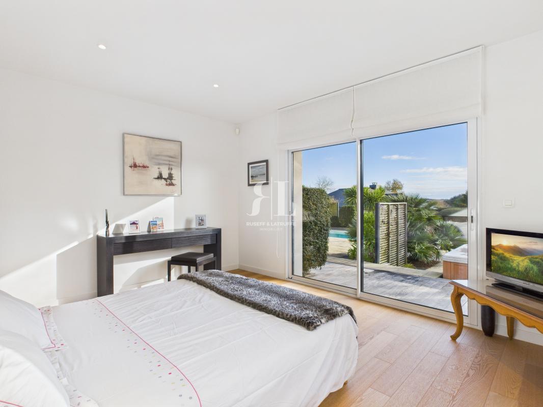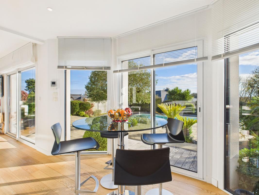 La cuisine, aménagée et équipée, s'intègre harmonieusement à l'ensemble et accompagne une vie de plain-pied appréciable avec une superbe suite parentale comprenant dressing et vaste salle de bains, véritable cocon ouvert sur le jardin. Un bureau et un espace de rangement complètent ce niveau.
