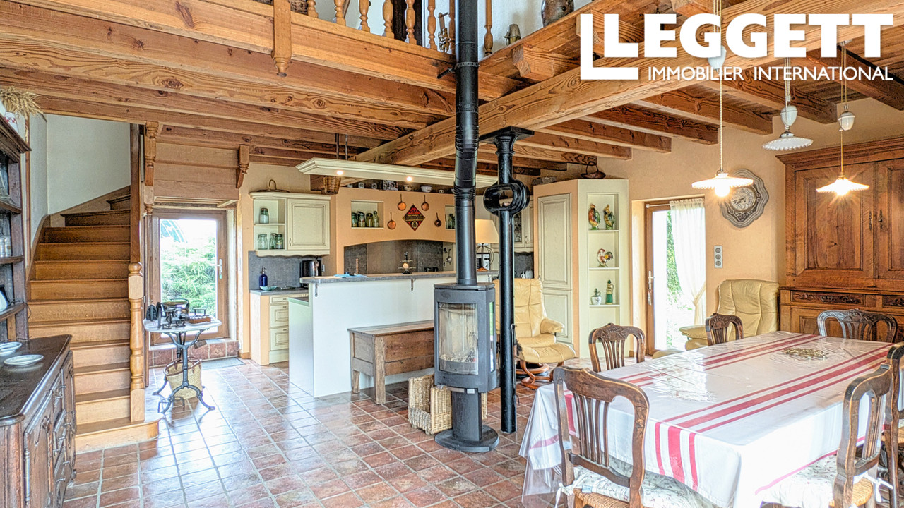 Le rez-de-chaussée offre un espace cuisine/salle à manger ouvert, avec une cheminée à bois centrale, tandis que les poutres apparentes et un atrium central confèrent du caractère à l'ensemble. Un salon confortable avec une deuxième cheminée et des murs en pierres apparentes invite à se retrouver. L'aspect pratique n'est pas négligé : buanderie, salle de bains et toilettes séparées au rez-de-chaussée, sans oublier l'efficacité énergétique.