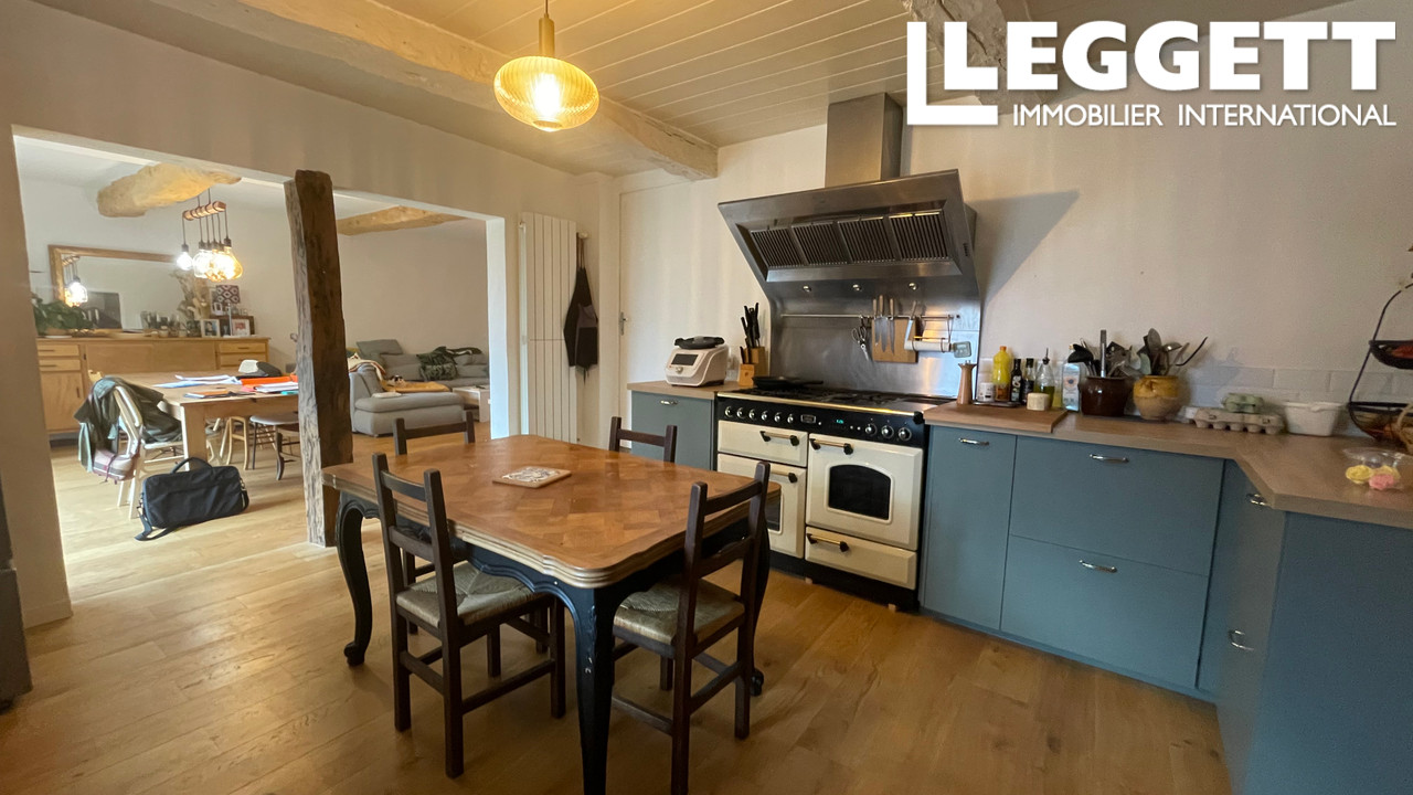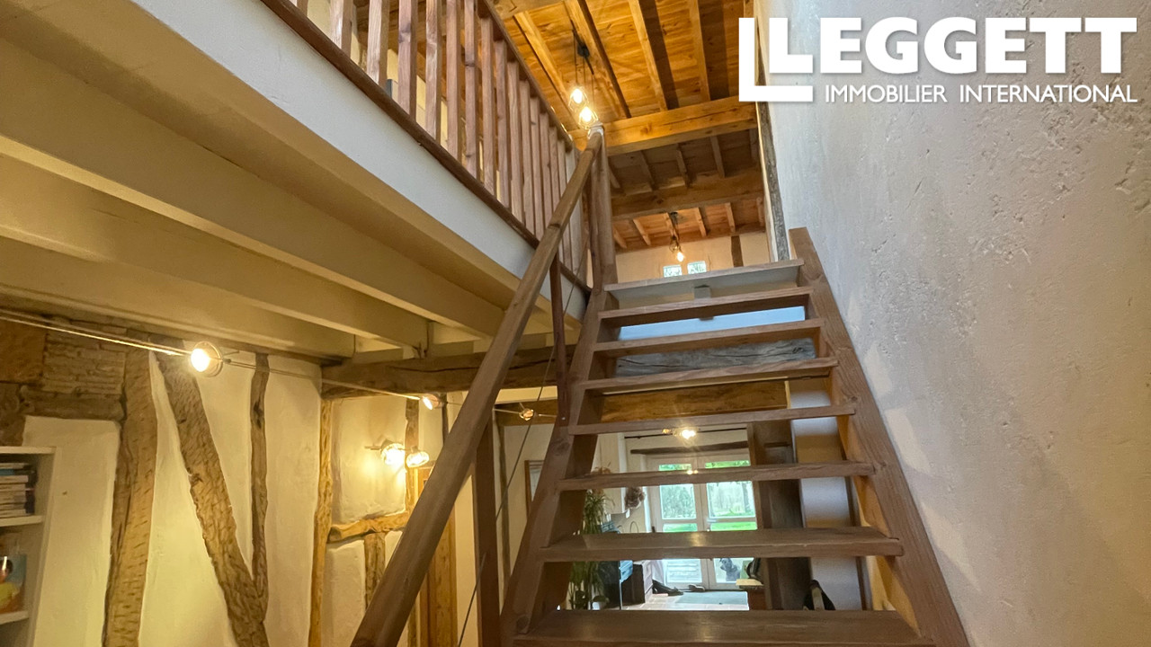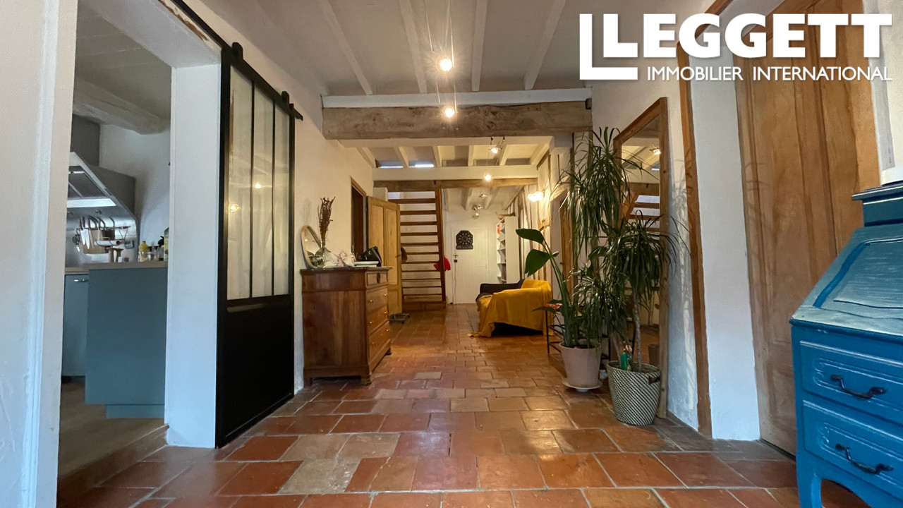 Beaux éléments anciens rénovés (colombages, terres cuites au sol, poutres apparentes).
