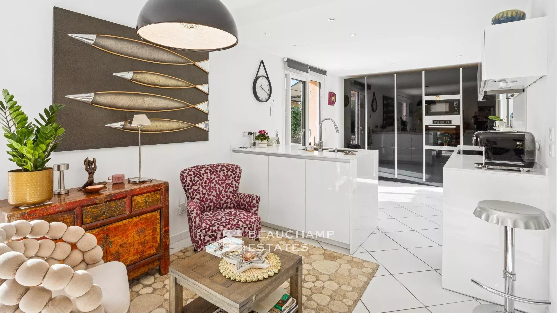 La villa bénéficie de climatisation réversible, de la fibre optique, d’un système d’alarme et d’un garage avec borne de recharge 24 kW