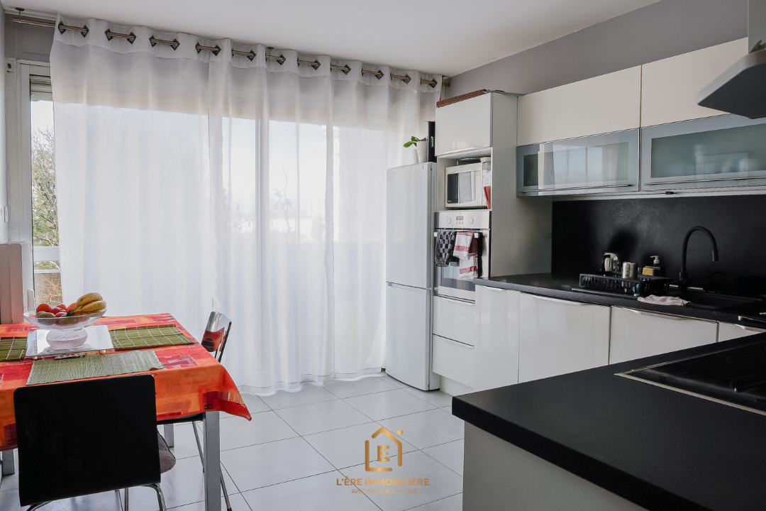 La cuisine séparée, équipée meublée, bénéficie d'un accès au second balcon de 6.5m2 ainsi qu'à une loggia/cellier de 3.5m2, très pratique pour le rangement.