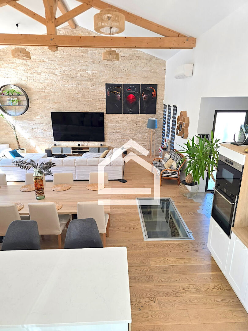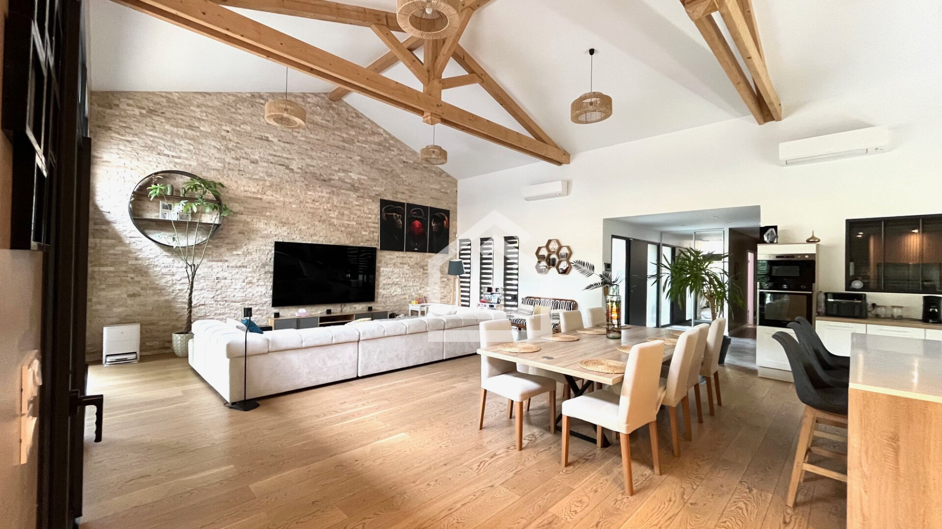 Dès l'entrée, la maison révèle une pièce de vie spectaculaire de près de 80 m², baignée de lumière grâce à de larges baies vitrées qui ouvrent sur le jardin et la piscine. Les espaces se prolongent harmonieusement les uns vers les autres : un salon raffiné, un espace repas convivial et une cuisine contemporaine parfaitement équipée, sublimée par une cave à vin vitrée intégrée qui apporte une signature unique à l'ensemble.
