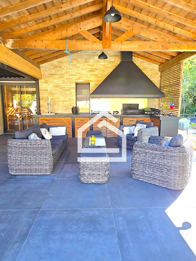 À l'extérieur, le jardin, sans aucun vis-à-vis et bordé d'une zone naturelle, offre une atmosphère confidentielle idéale pour se ressourcer. La piscine chauffée de 10 × 5 m, dotée de deux grandes plages, constitue la pièce maîtresse des lieux. Une terrasse ombragée par une pergola bioclimatique accueille une cuisine d'été entièrement équipée, parfaite pour recevoir.