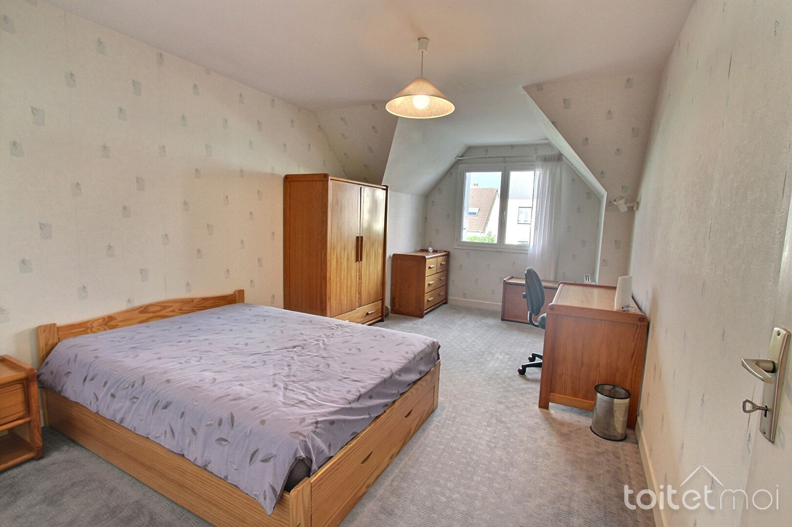 L'étage est composé de trois grandes chambres, d'un bureau, de deux salles de bains avec baignoire et douche, et de toilettes séparés. Les chambres sont toutes équipées de placards.