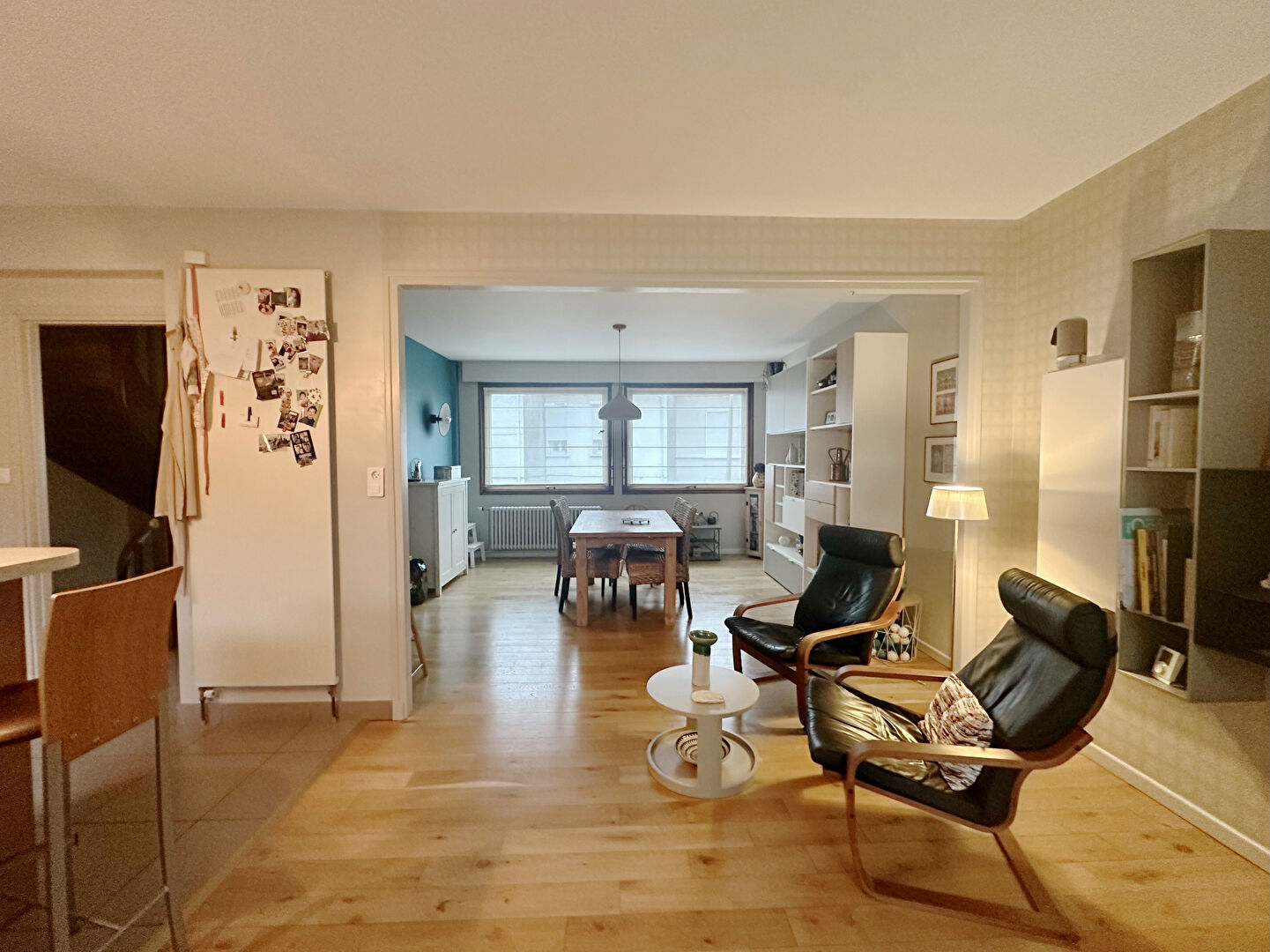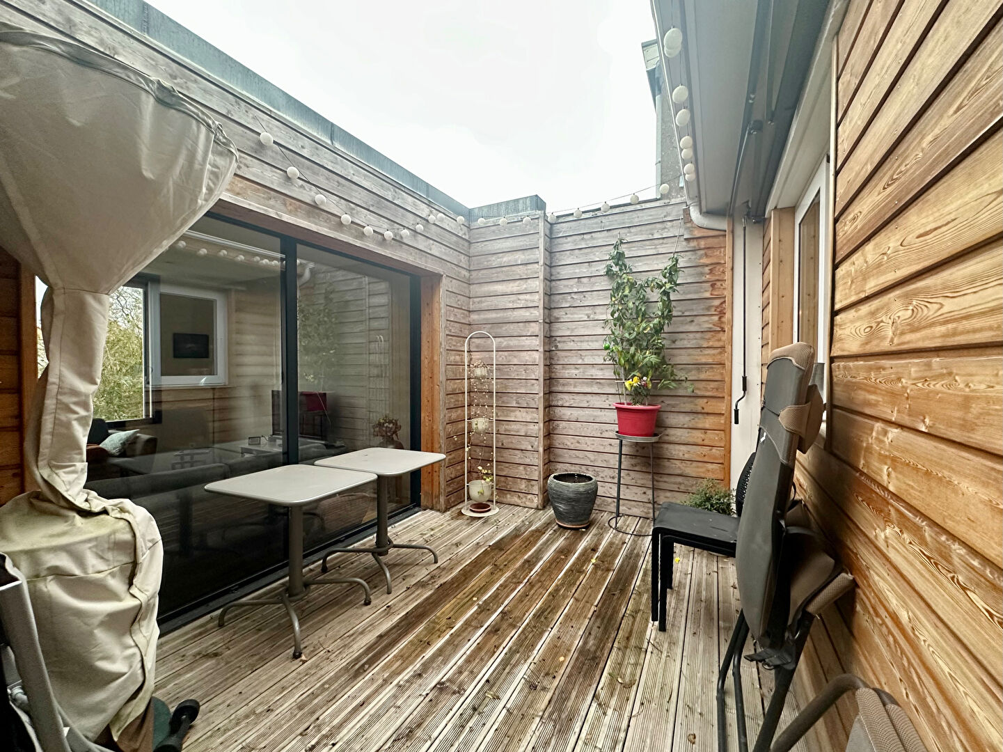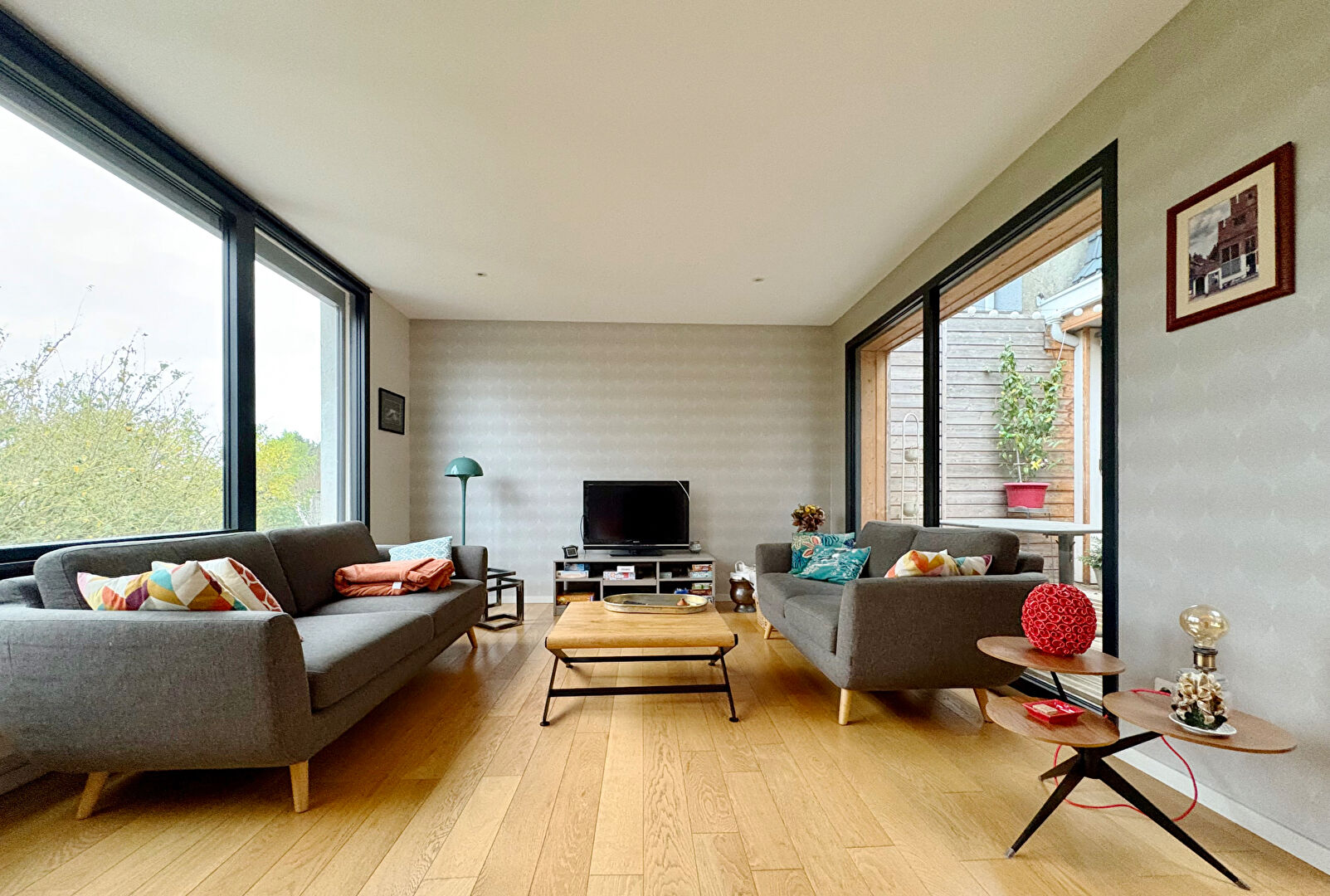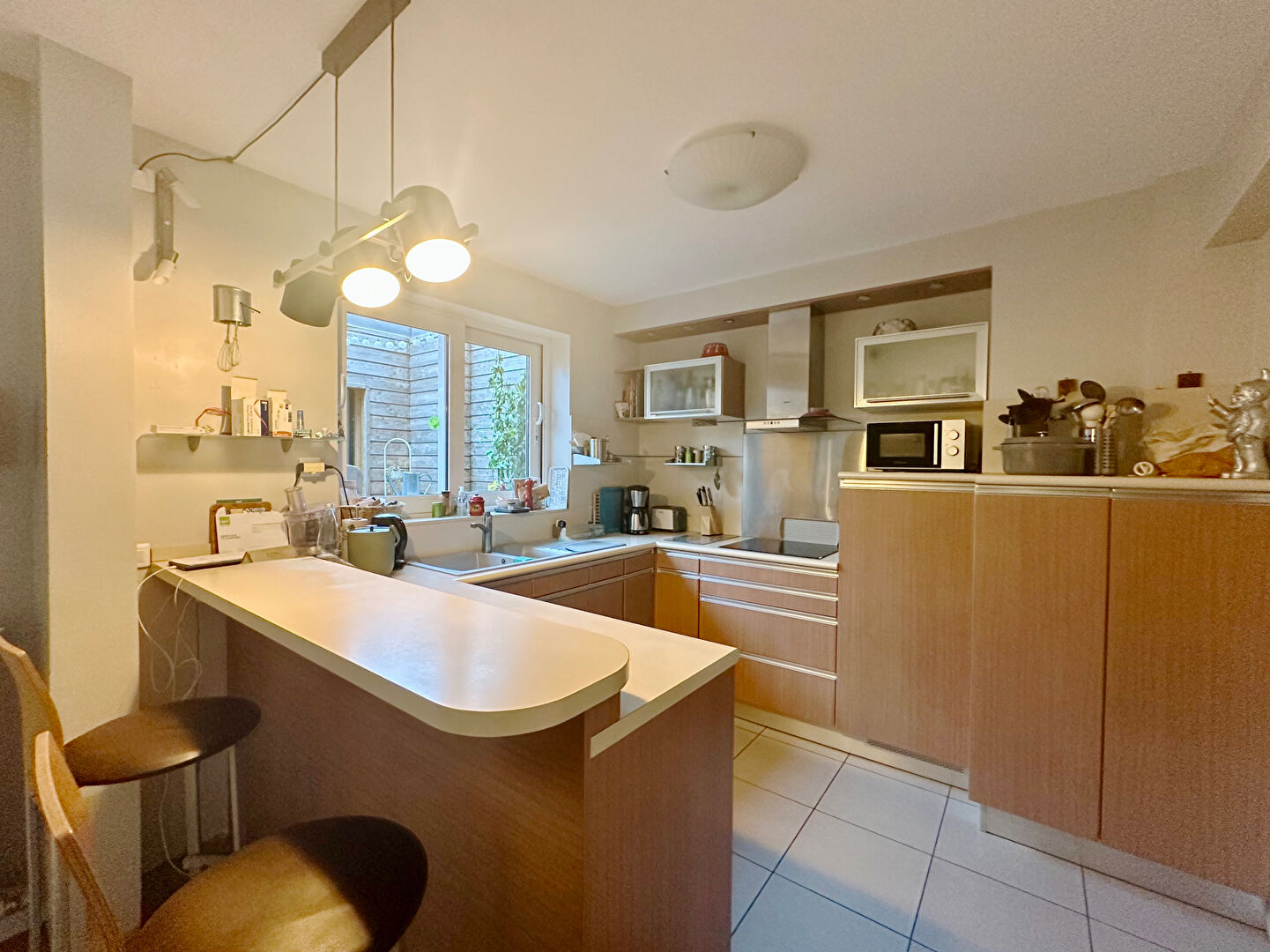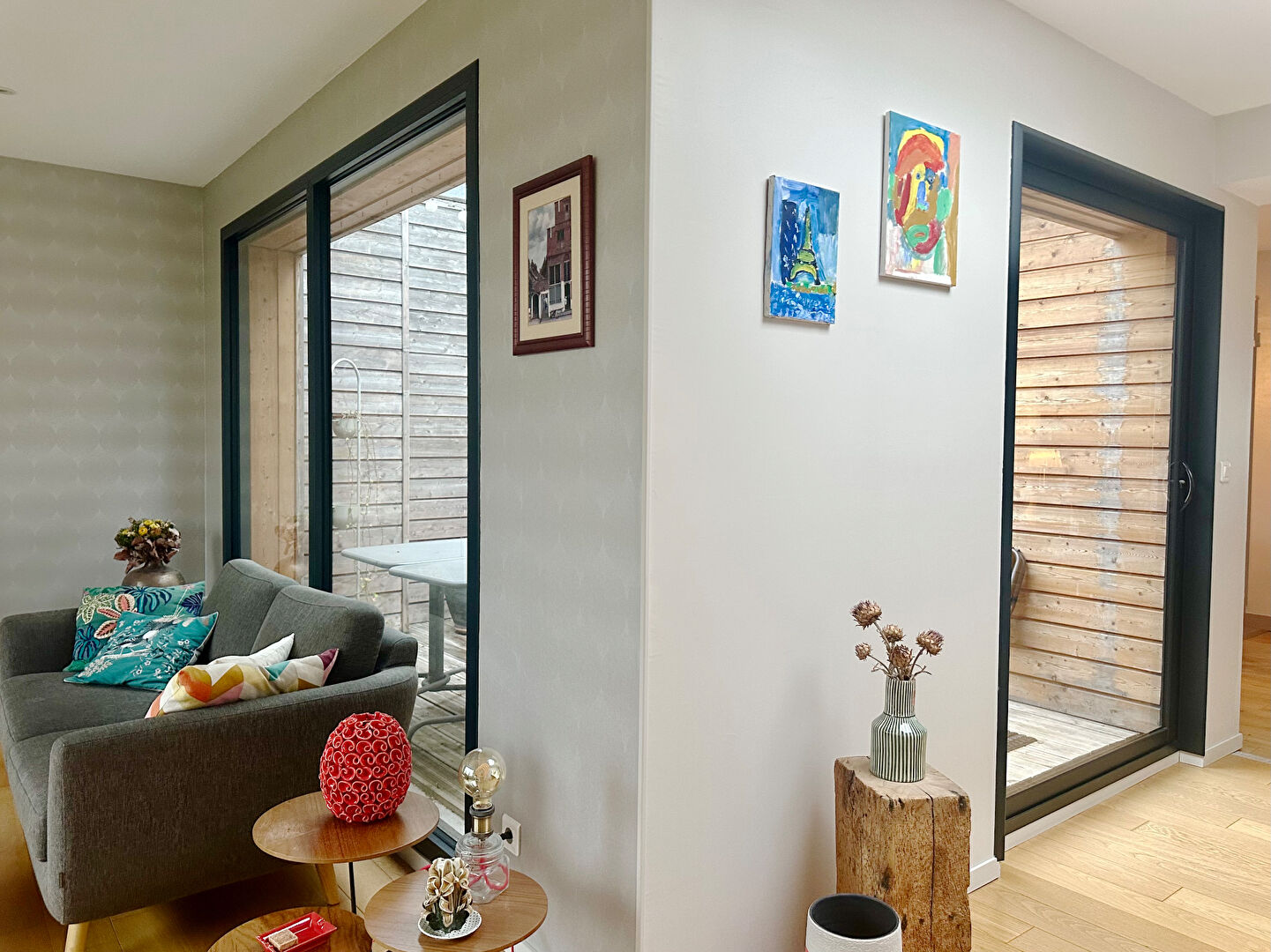 À l' étage, un très beau salon séjour parqueté avec la cuisine américaine entièrement équipée s'ouvre sur la terrasse en patio ,