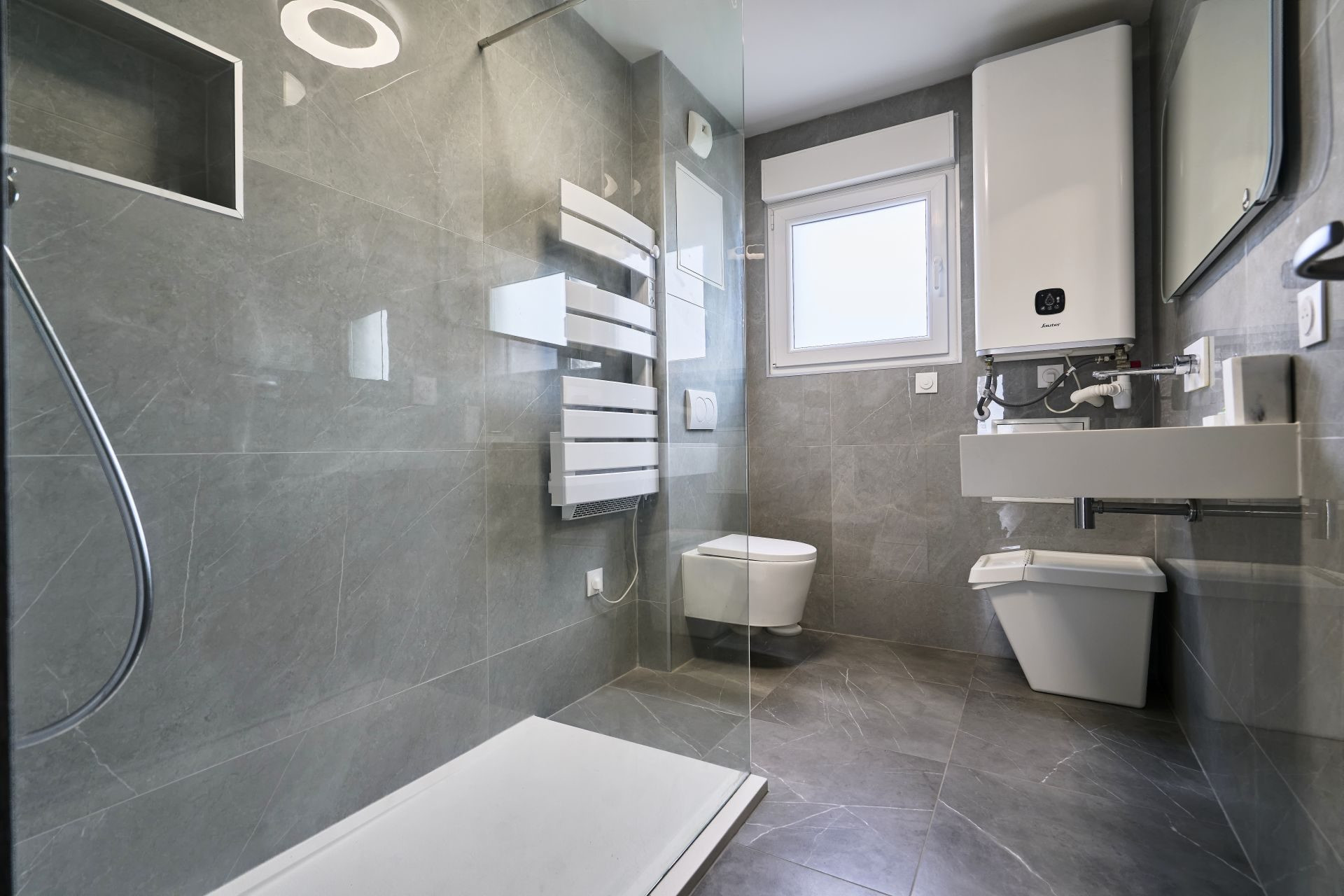 Elle dispose d'une cuisine équipée ouverte sur le séjour avec une large baie vitrée sur la terrasse et le jardin, un espace buanderie et WC séparé.
