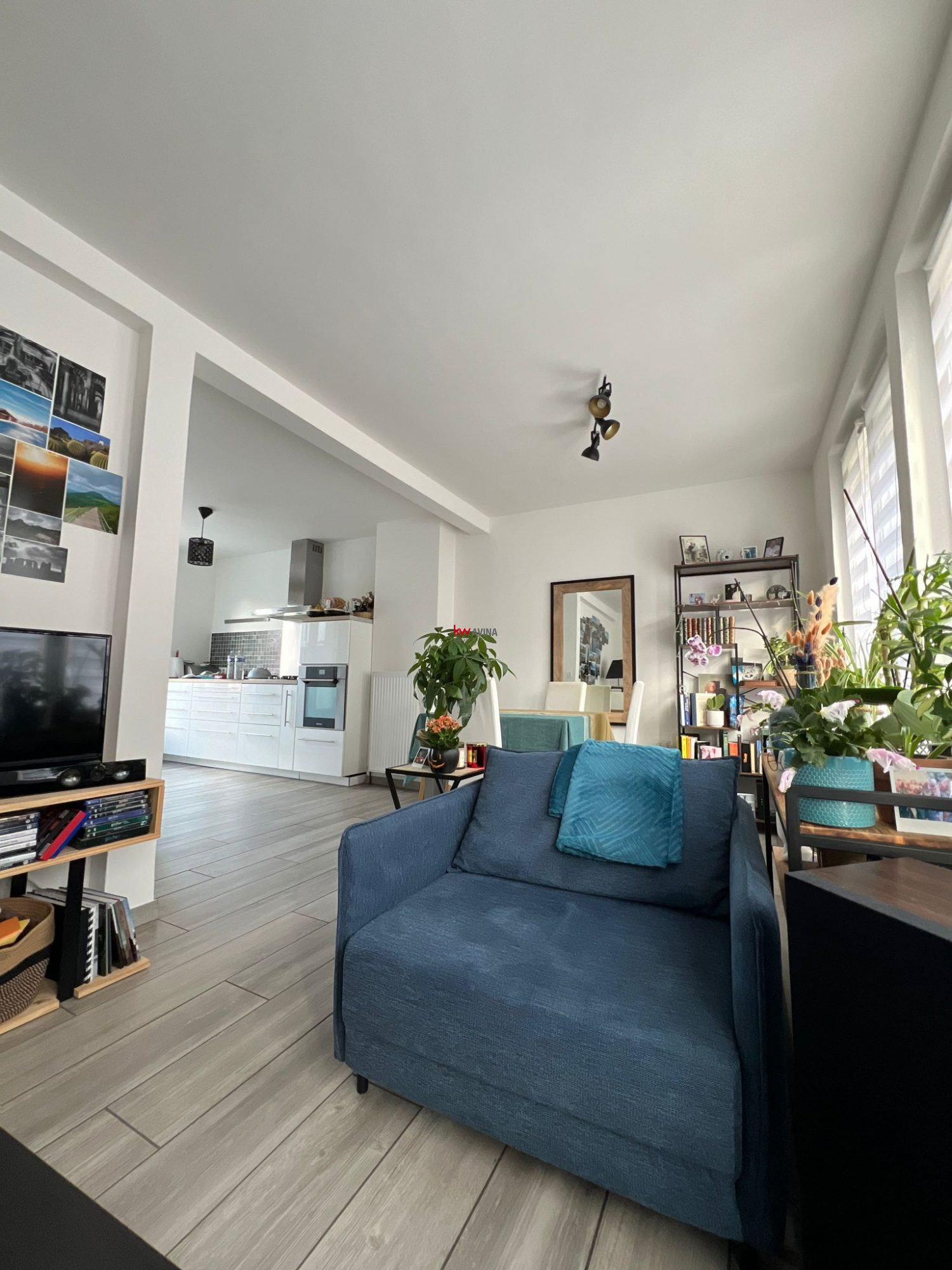 Belle pièce de vie traversante ouverte sur une cuisine moderne équipée