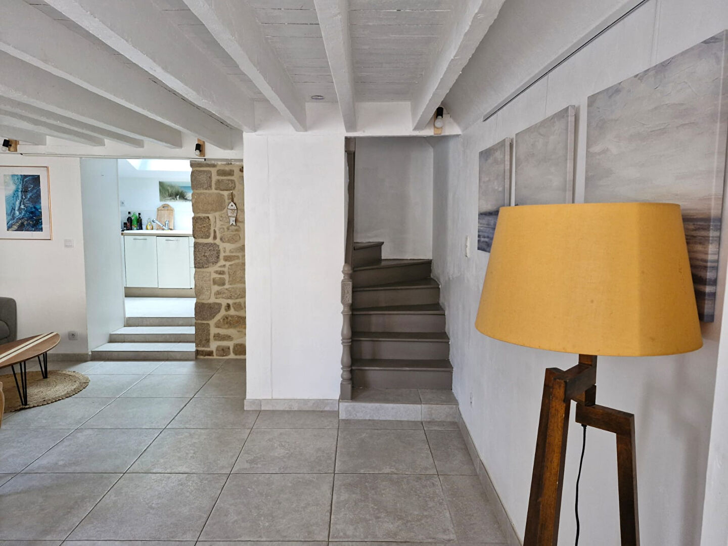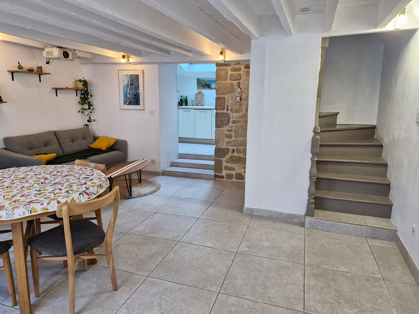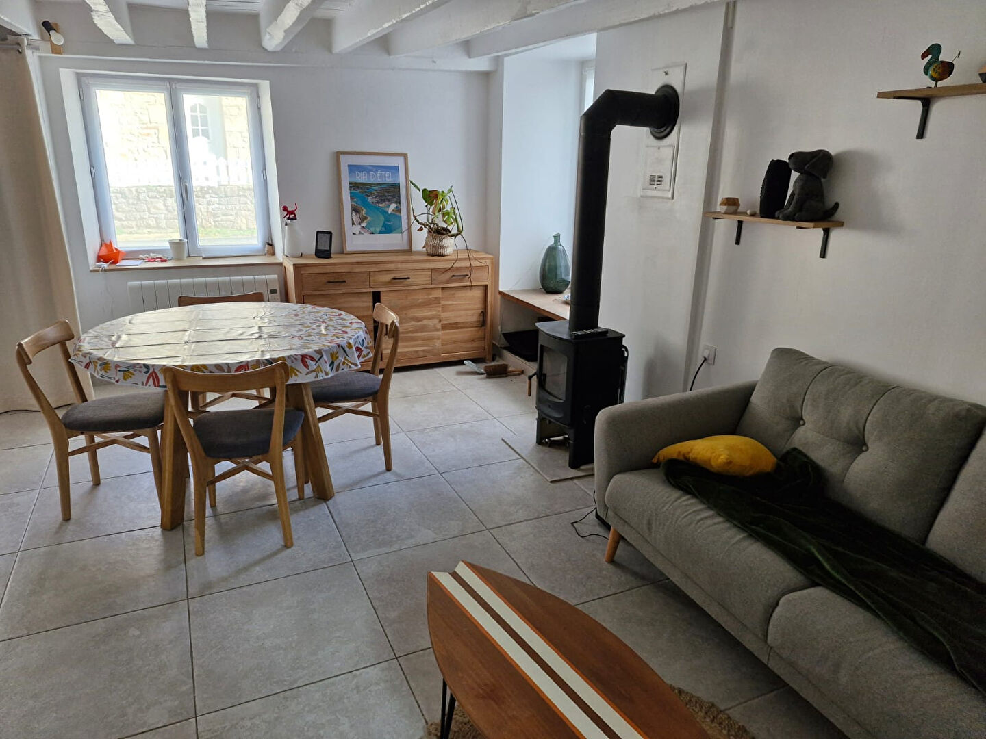 En exclusivité, à ETEL, située dans le centre et à 200 m du Port , Coup de coeur pour cette charmante maison en pierres rénovée en 2013 offrant au rdc : un séjour avec poêle à bois, une cuisine aménagée équipée, une buanderie, un wc. Au 1er étage : une grande chambre avec dressing et coin bureau, ainsi qu'une salle d'eau avec wc. Au 2ème étage: une chambre avec cabinet de toilette (lavabo et wc). Cour. Garantie revente 7 ans offerte.