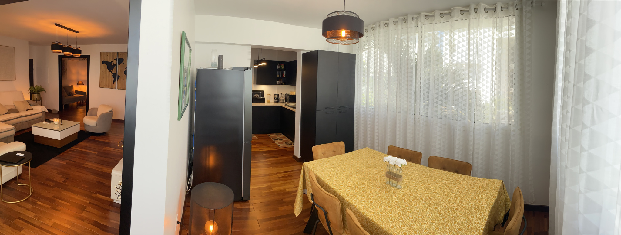 L'appartement possède un salon, un salle à manger, une cuisine premium équipée, 3 chambres dont une master room, un bureau, 2 salles de bain et deux WC.